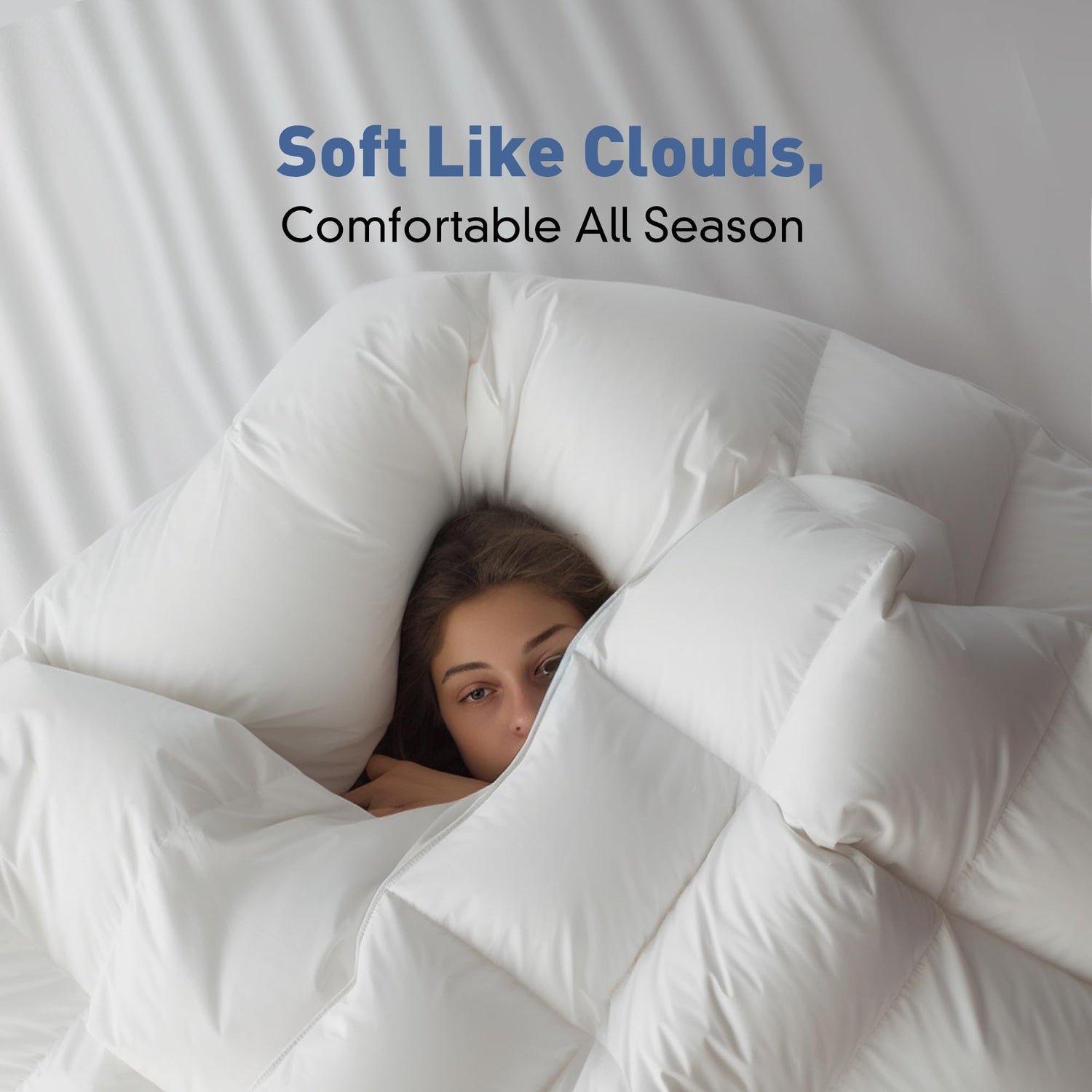 - Premium Down Comforter Material - Quality sleep starts with good sleep hygiene. Filling - 70% white goose feather fiber and 30% white goose down fiber. Our 33 rigorous down-washing procedures achieve an exceptional cleanliness level of over 1000+. Our special FreshLoft processing makes the down and feathers hypoallergenic. The premium filling meets ADFC and OEKO-TEX standards, ensuring it is fluffy and odorless.