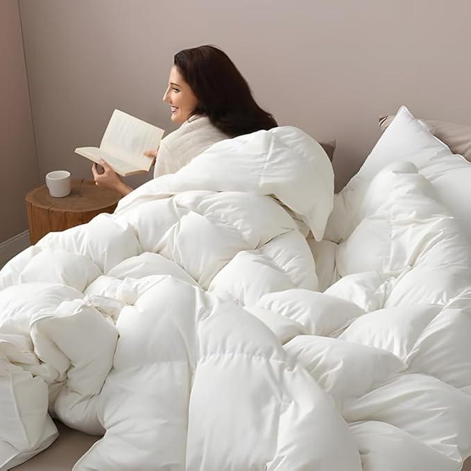 - PREMIUM DOWN FIBER FILLING - The luxury white down comforter provides great warmth and cooling properties for most people's year-round comfort. Highly fluffy down fiber makes an incomparable lightweight and softness, ensuring you remain comfortably dry while staying warm. Experience the magic of a "breathable" comforter, keeps you cozy and fresh all night