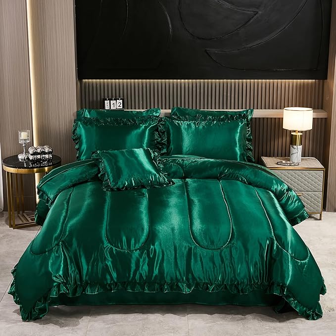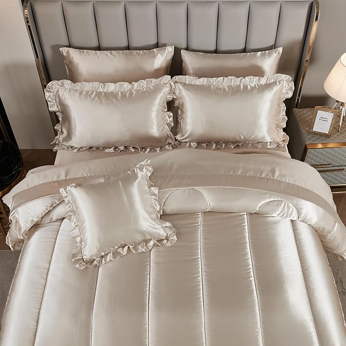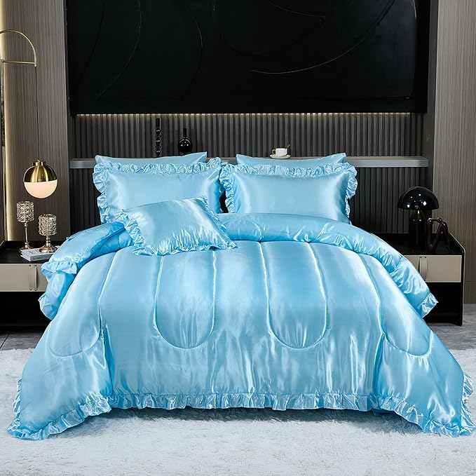 - LUXURY SILK LIKE IMITATED FABRIC - European style satin comforter set with sheet Set. Artificial silk combine the advantages of silk and artificial materials, full of luxury texture. The appearance of the fabric is softer and elegant, like the luster of the pearl; Super smoothly, soft and comfortable, flexible. Texture is also relatively thin, feel crisp. Cool skin care in summer, color is extra bright and gorgeous, it's best for you to decorate luxury and charming style bedroom in all season.