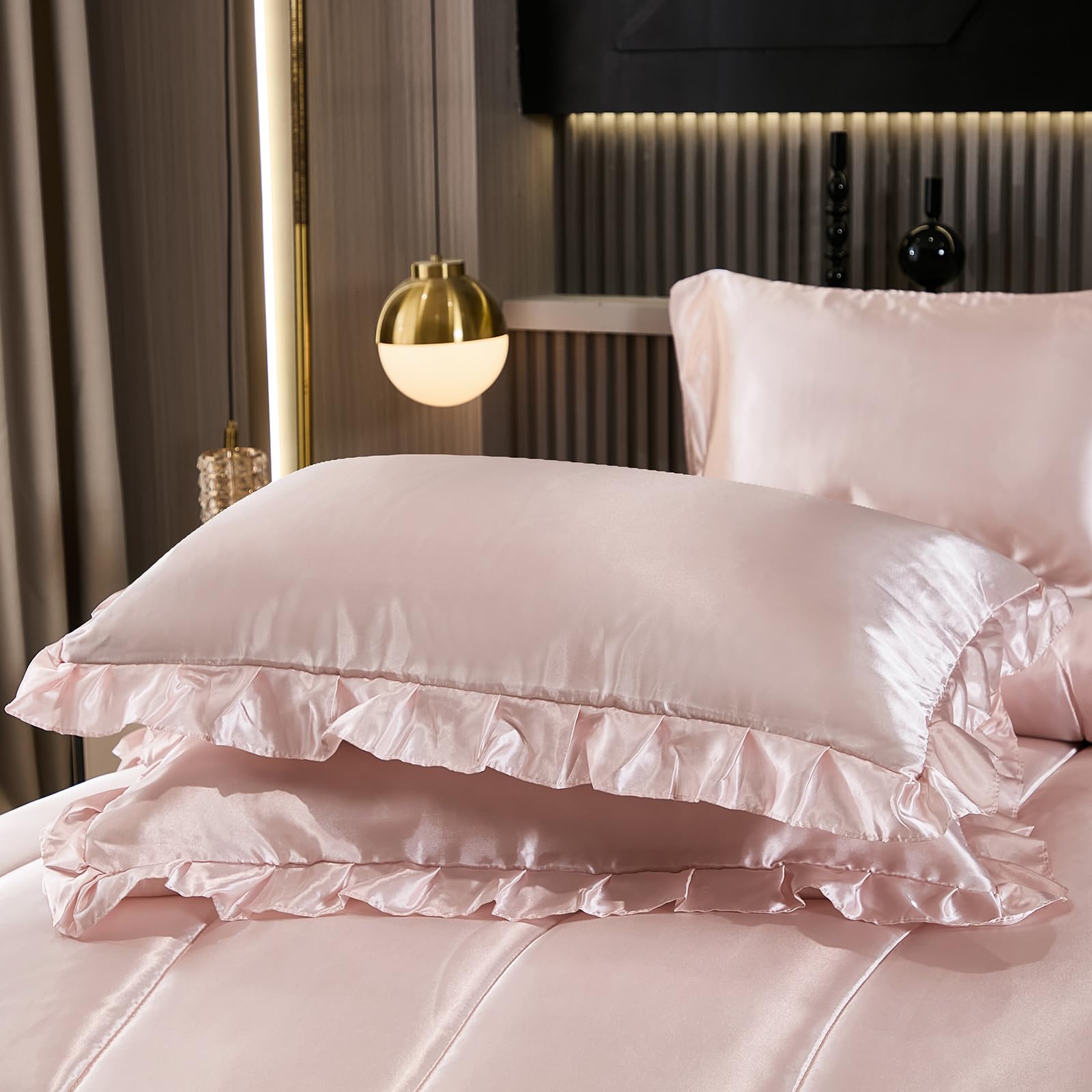 - QUEEN COMFORTER SET with SHEET SET - 1 light pink satin ruffle comforter(90''*90'') + 2 light pink satin ruffle pillowcases(20''*30'') + 2 light pink satin pillowcases(20''*30'') + 1 light pink satin flat sheet(90''*104'') + 1 light pink satin fitted sheet(60''*80'' + 12'') + 1 light pink satin ruffle cushion cover(18''*18'')