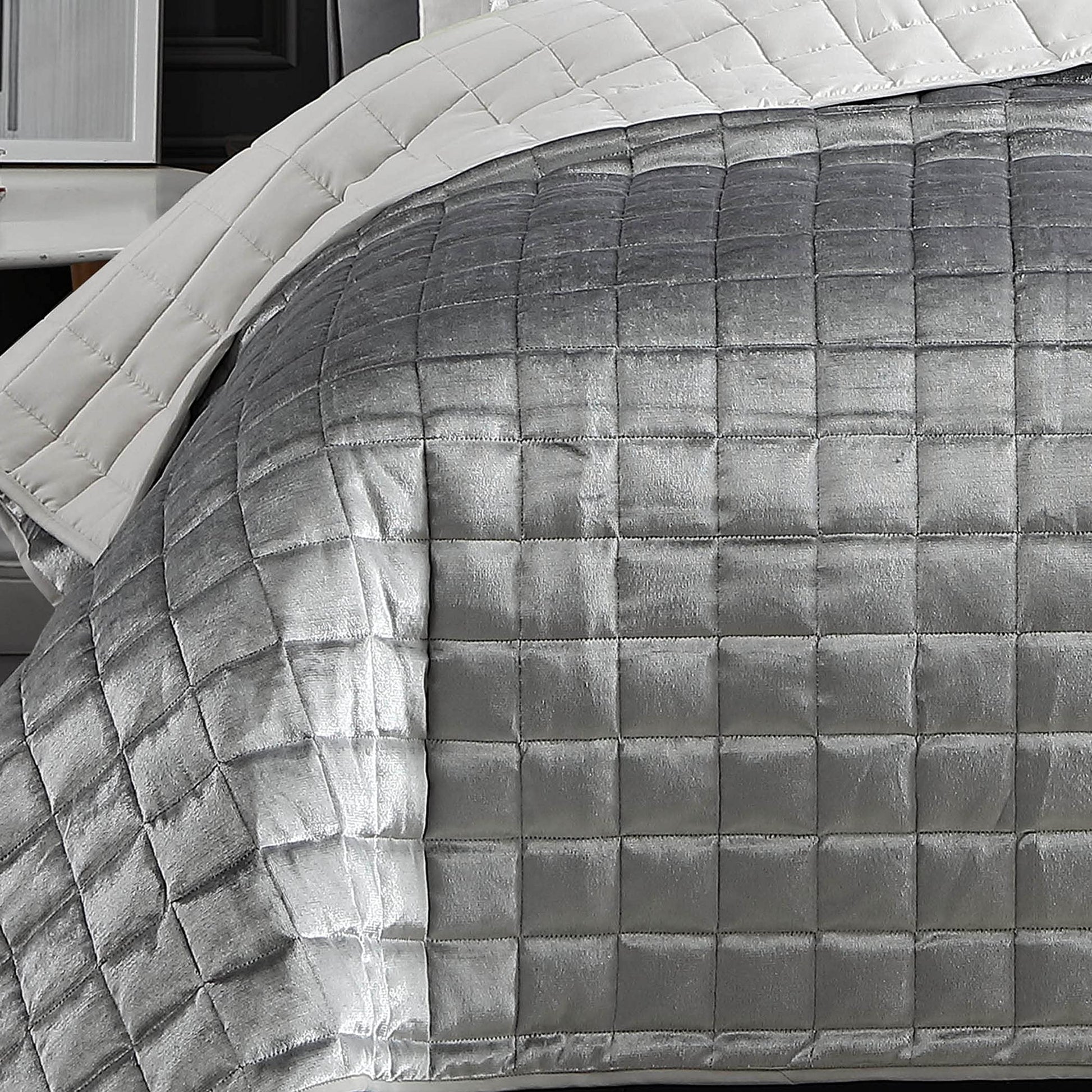 Elevate your bedroom with the luxurious Lyndon 3-piece quilt set, featuring stunning shimmer velvet in vibrant silver. This contemporary bedding collection combines modern geometric stitching with old-world luxury, creating a versatile look that complements both traditional and contemporary décor.