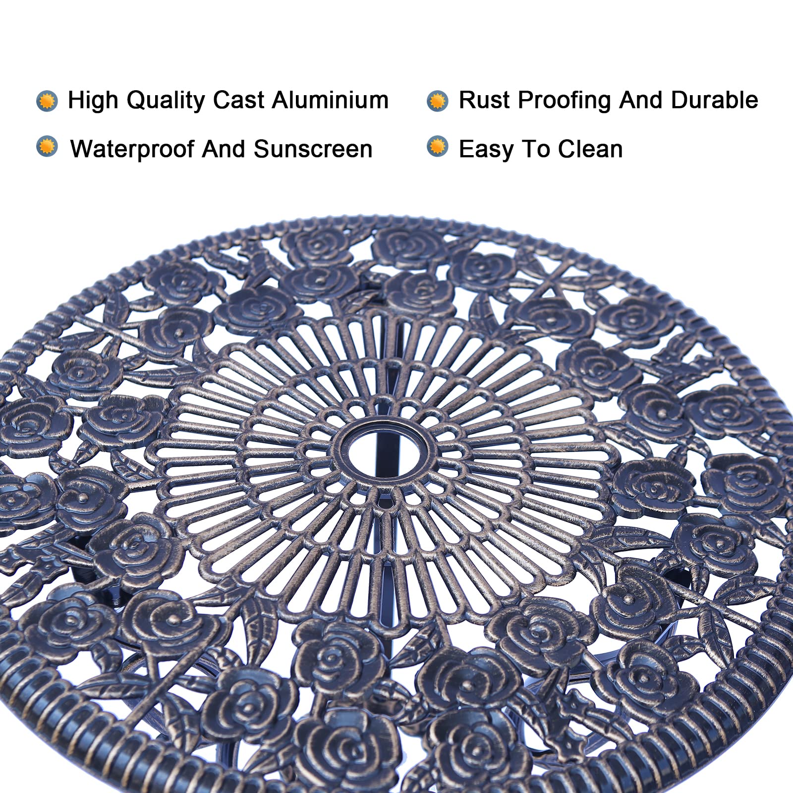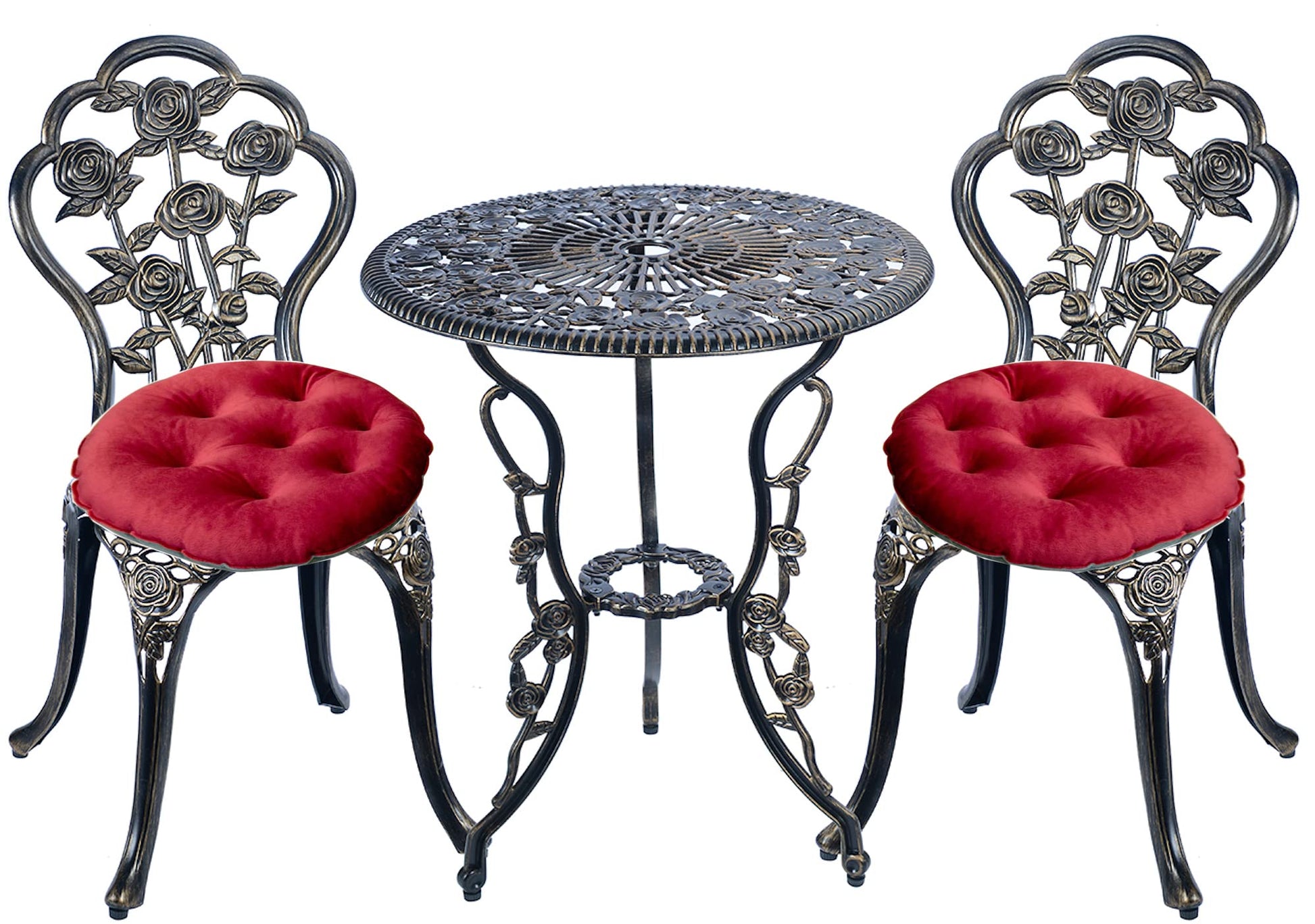 - CAST ALUMINUM :This outdoor table and chairs set made of high quality cast aluminum.Waterproof and sun resistant,rust proofing and durable,easy to clean,elegant Rose pattern antique finish adorn the table and chair . The surface of the table and chair is smooth without burr,you will get two pillows to Improve your sitting comfort