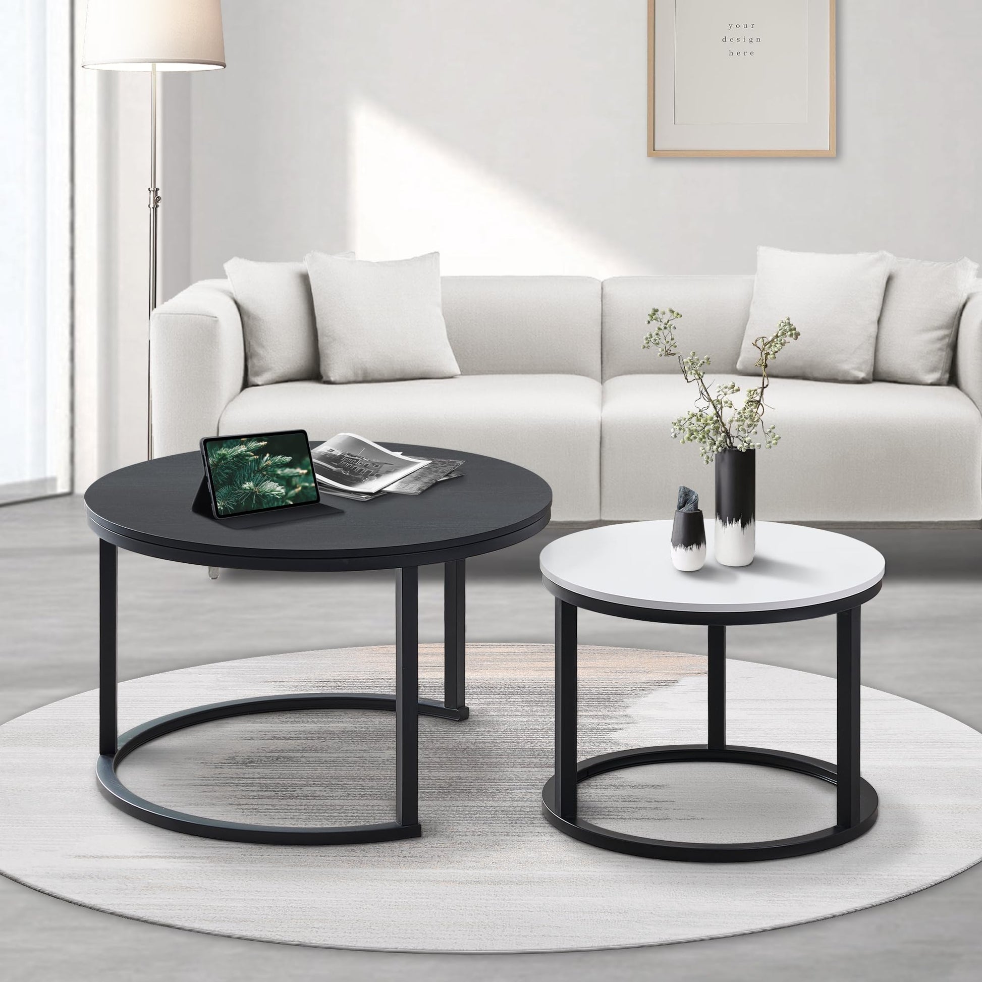 - A large and a small coffee tables set for many combinations, they can be combined at will to meet your needs. You can use modern coffee tables as a center table, end table or side table, and the small table can be placed under the large table without taking up too much floor space.