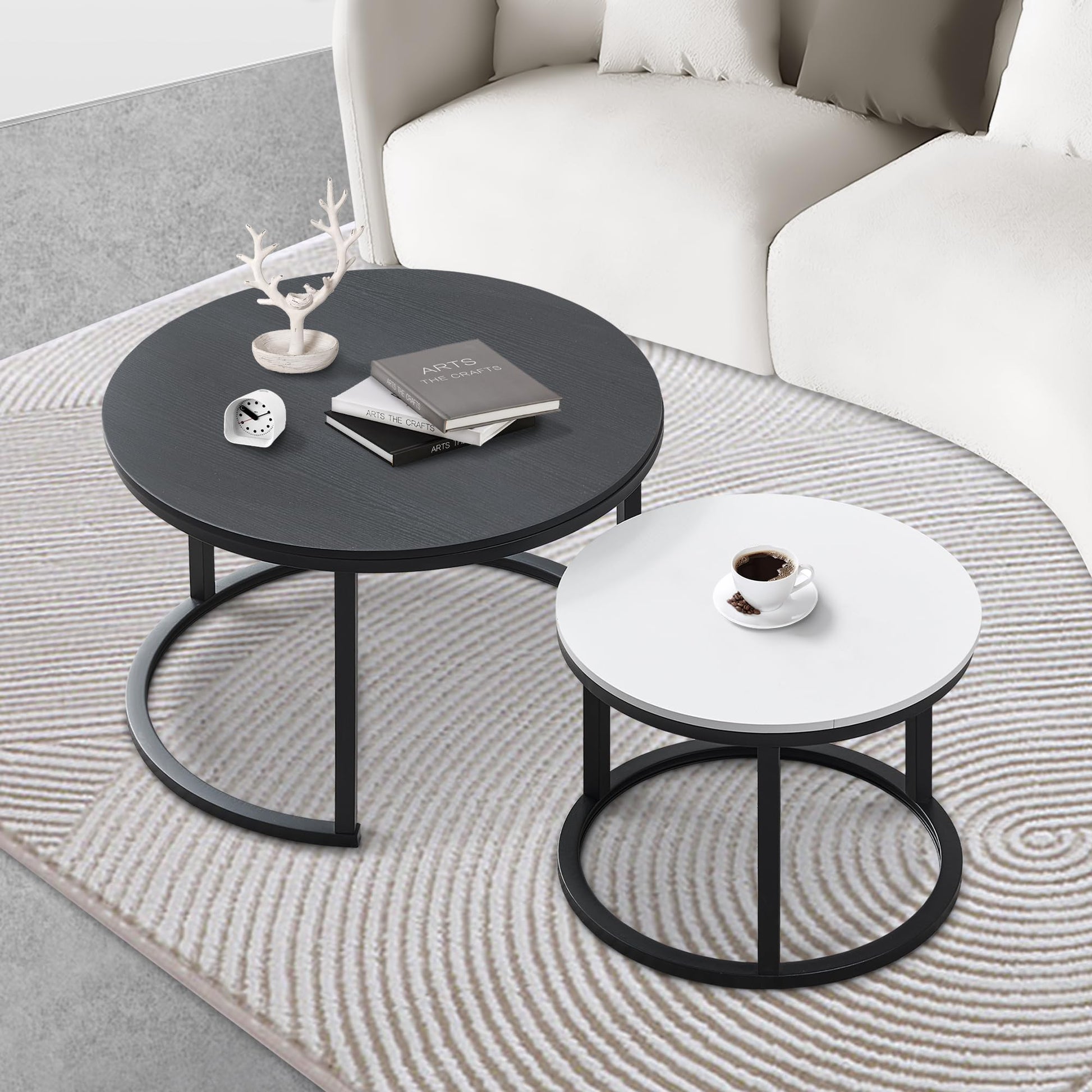 - Made nesting tables with a more ergonomic size was chosen by examining people's habits of using coffee tables. Dia. 27 1/2 inch table is suitable for placing more decors and increasing the storage needs of your living room. 17.5 inches in height, when you are sitting on the carpet, you are just at the right height from the tabletop for mobile office, parent-child time, low tea, and watching TV programs on a flat screen.