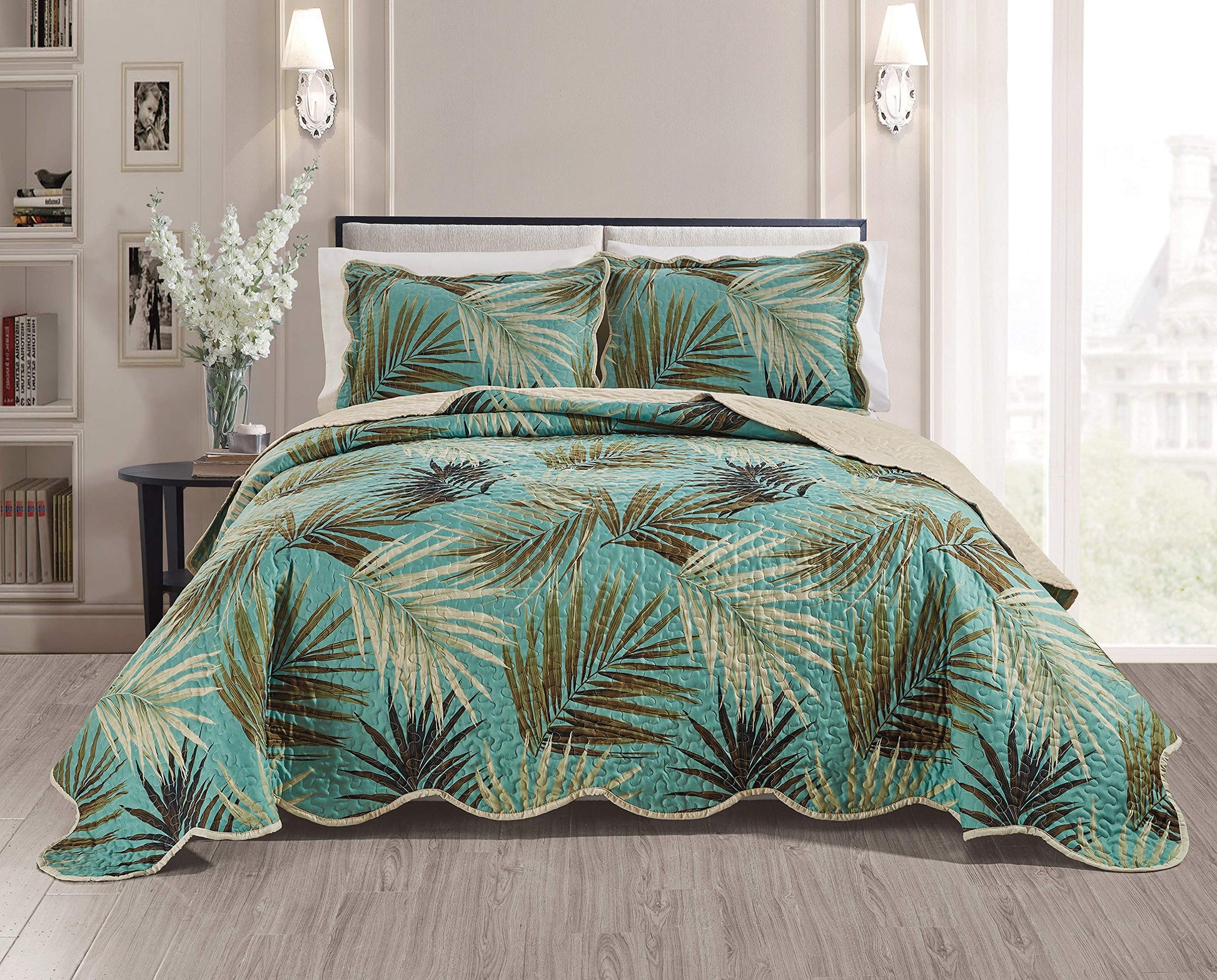 3-Piece Fine Printed Tropical Palm Leaves Oversize (115" X 95") Quilt Set