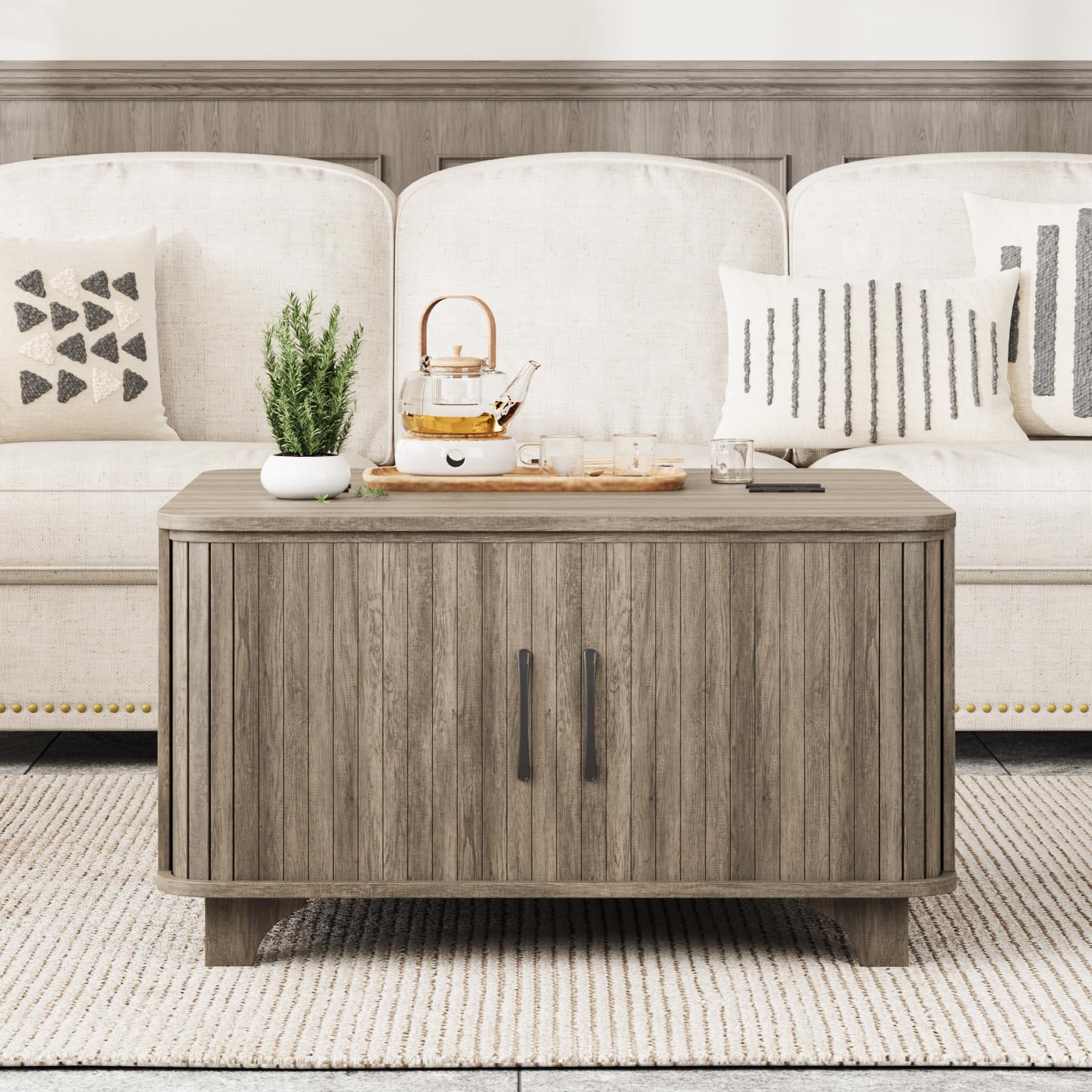 - FUNCTIONAL FLIP-TOPS: This farmhouse lift top coffee table includes 2 flip-tops with 2 hidden compartments and adjustable shelves, providing ample storage and easy access to your essentials while maintaining a stylish appearance.