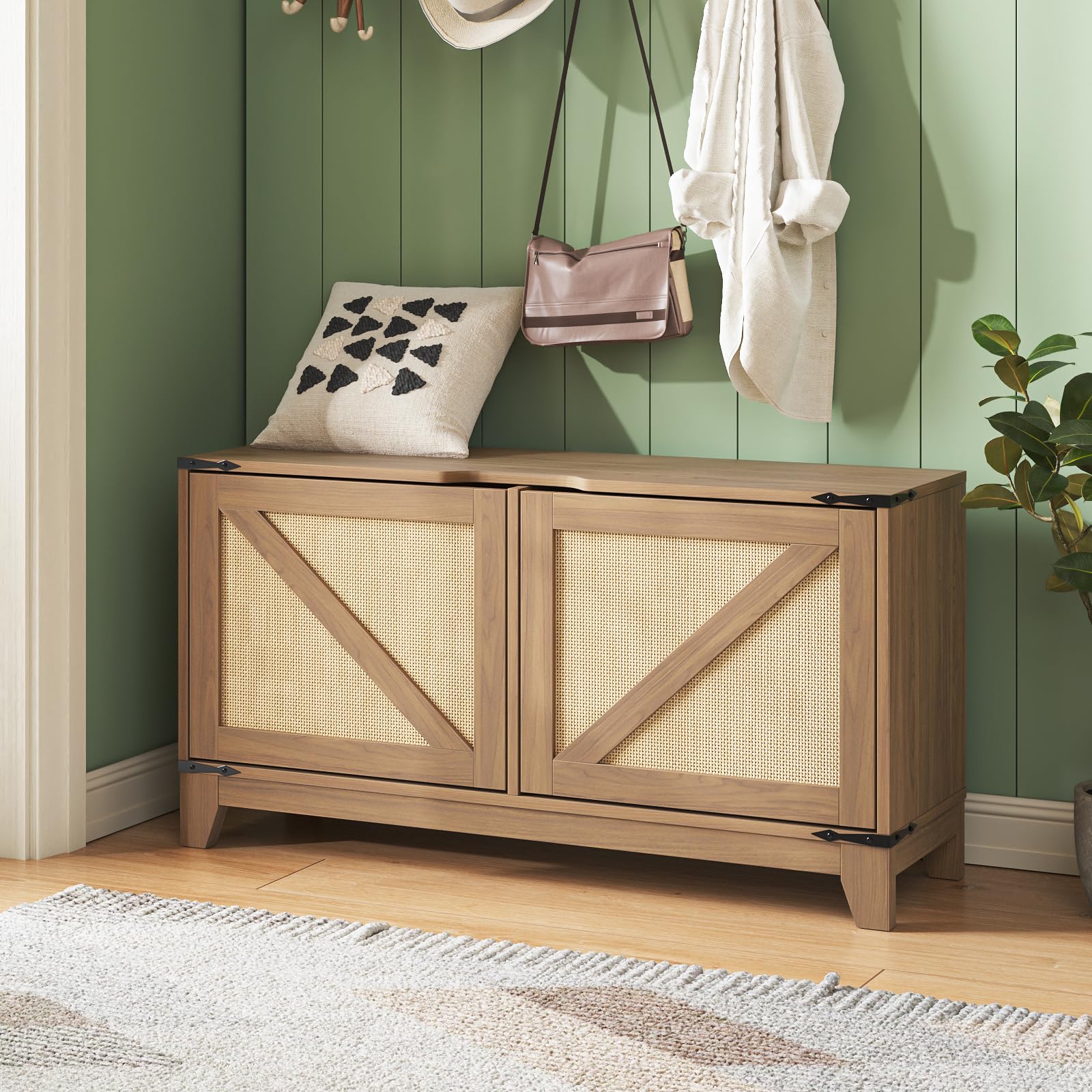 - Entryway Shoe Storage: Hidden Shoe Bench with 2 flip drawers, Farmhouse style design and traditional rattan elements combine to look great in many different home styles. Hand-woven rattan craftsmanship is harmless and odorless. Perfect for entryway, hallway, living room or porch, make your home look neat and space-saving