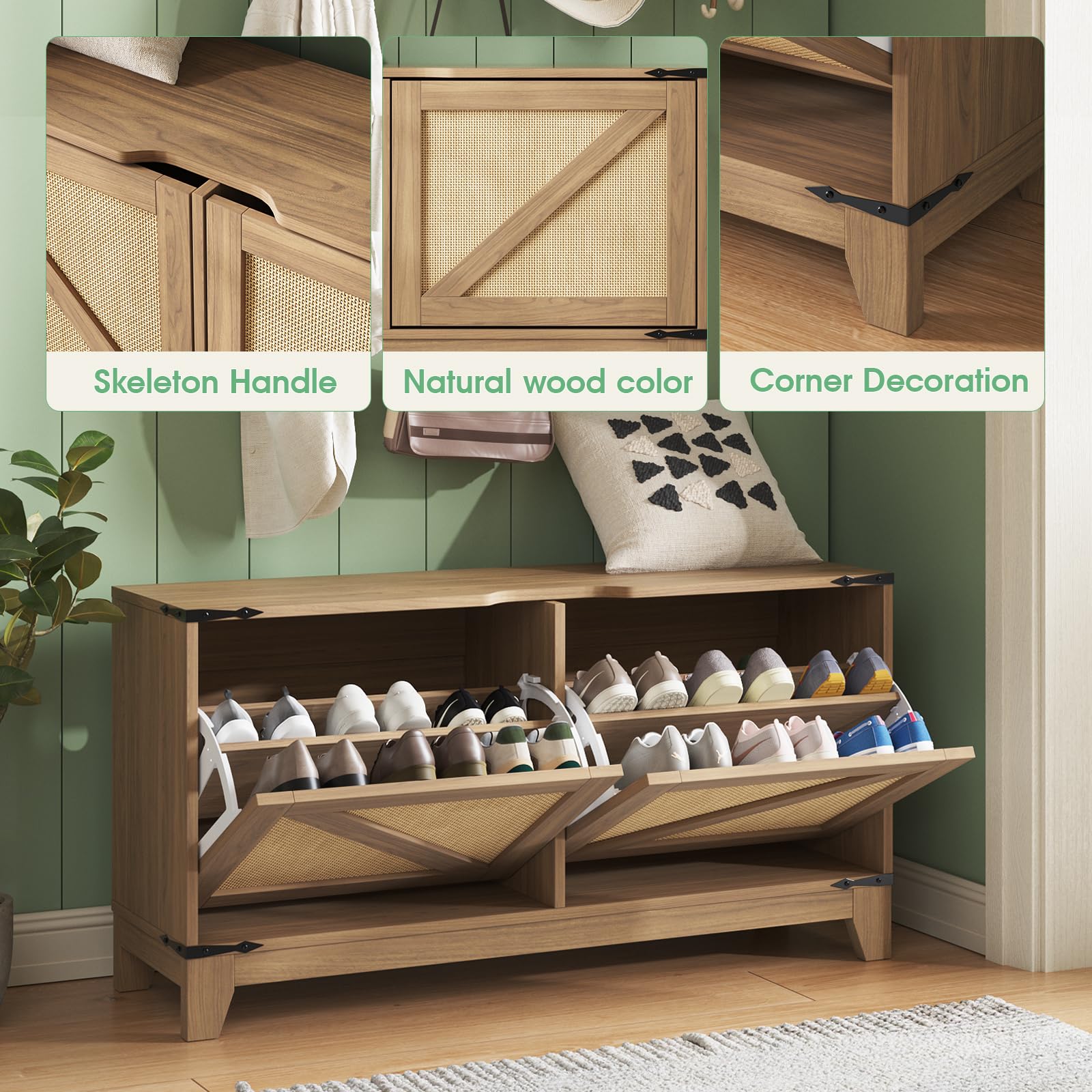 Maupvit Rattan-Like Shoe Bench with 2 Flip Drawers, Entryway Bench with Storage,