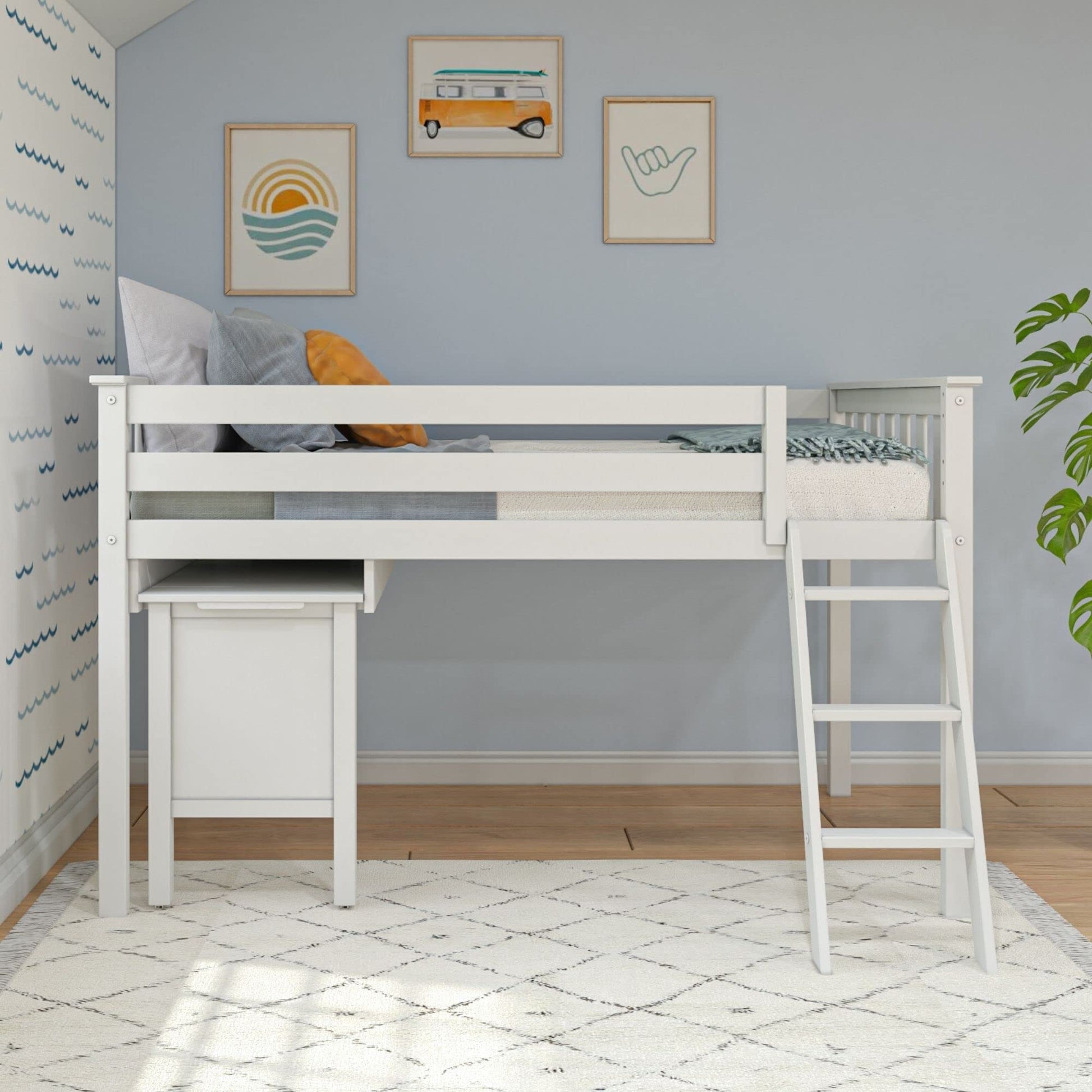 - w Twin Loft Bed with Desk: Low loft bed for kids is great for smaller spaces and low ceilings; Low-profile loft design is safe for younger children; Pull-out desk is perfect for studying, creating art, or for use as a bedside table