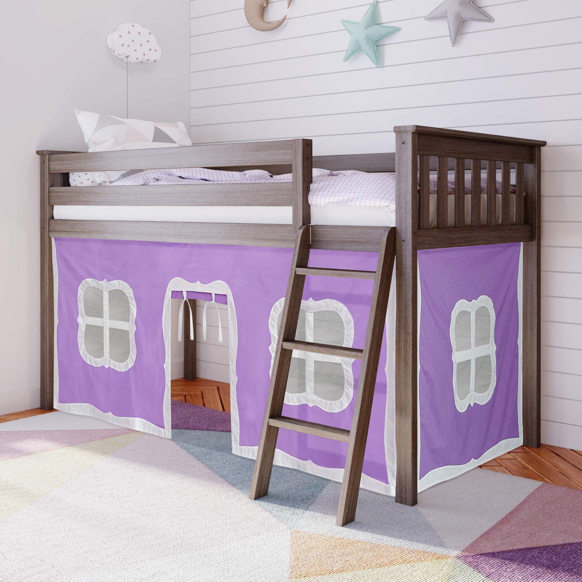 Low Loft Bed, Twin Bed Frame With Curtains For Bottom, Clay/Purple