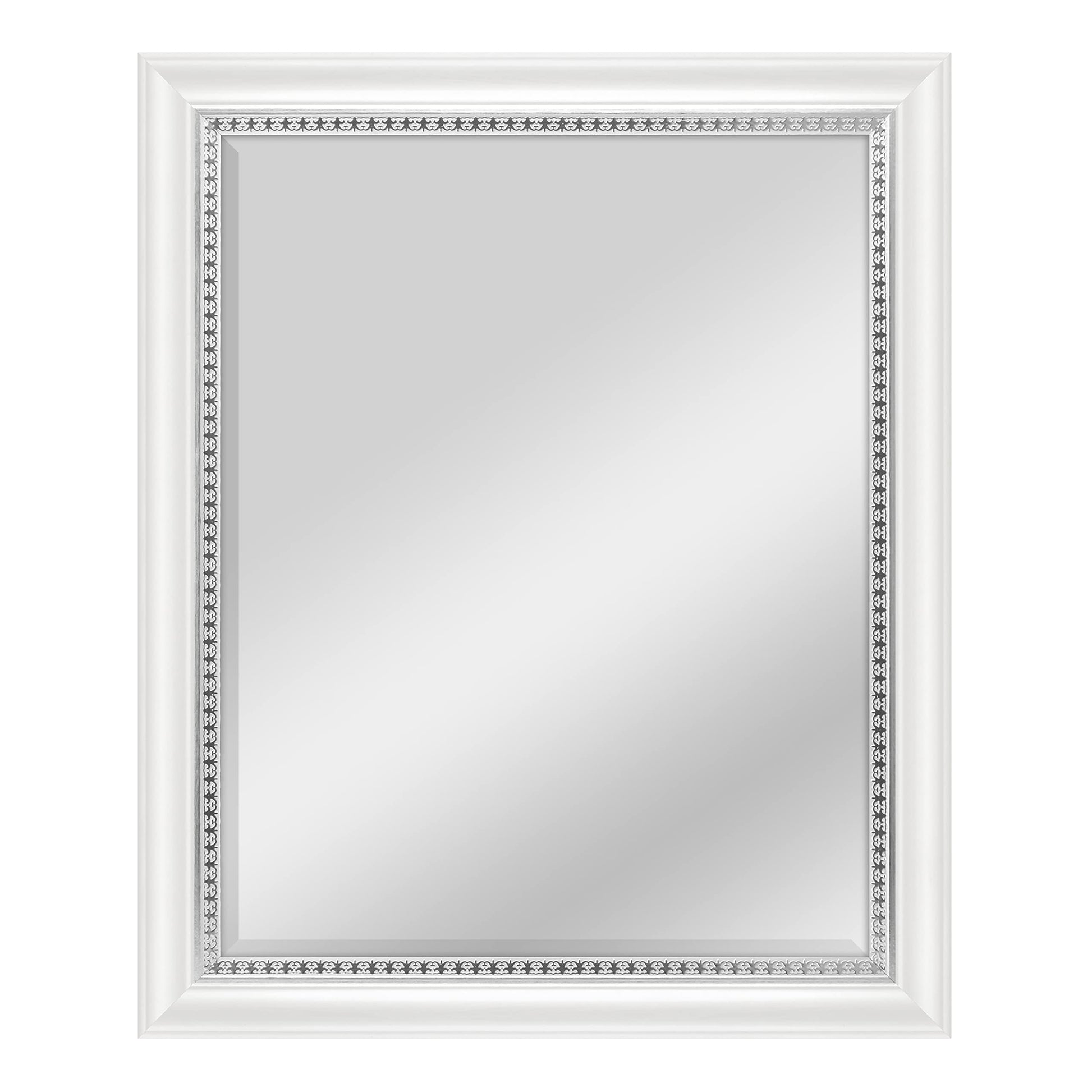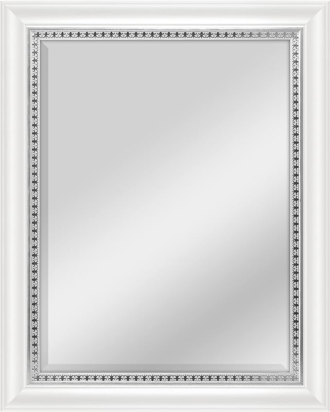 - The 2. 75 inch wide frame has a white woodgrain with a decorative embossed silver inner edge