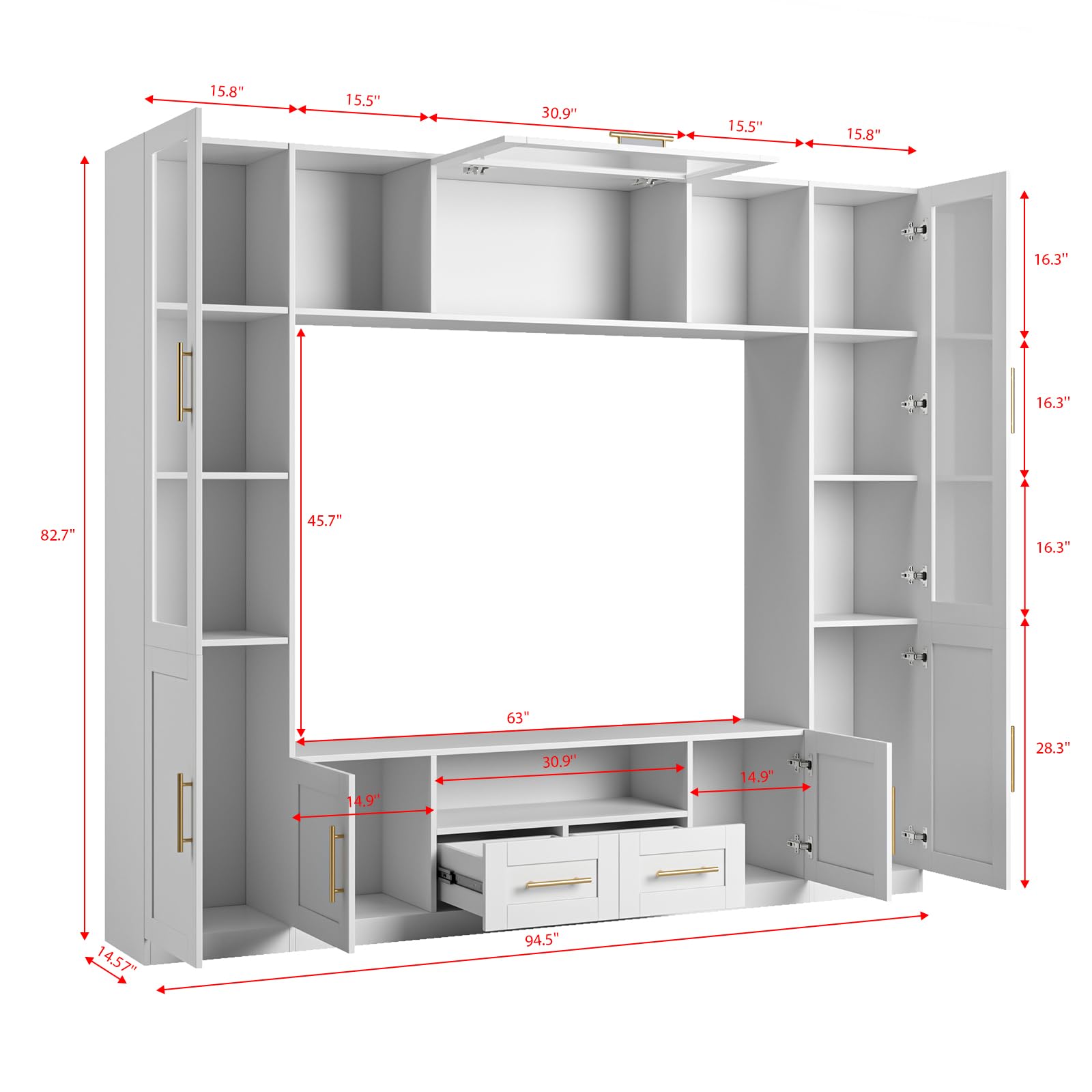 - The large entertainment center with bookshelves overall size is 94.5"Wx14.6" Dx82.7"H. We provide long-term assembly guidance for this large TV stand unit. If you encounter any problems with TV entertainment center quality, logistics status or assembly instructions, let us know anytime before or after your purchase.