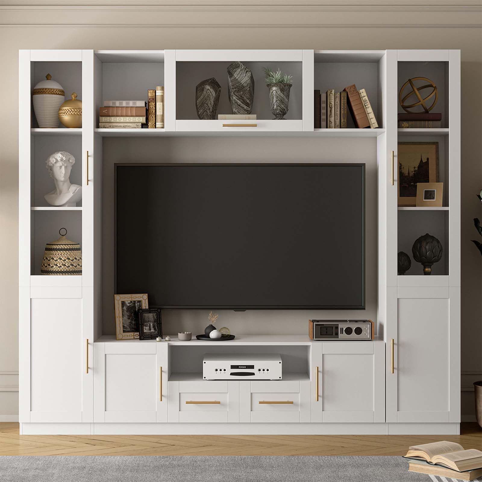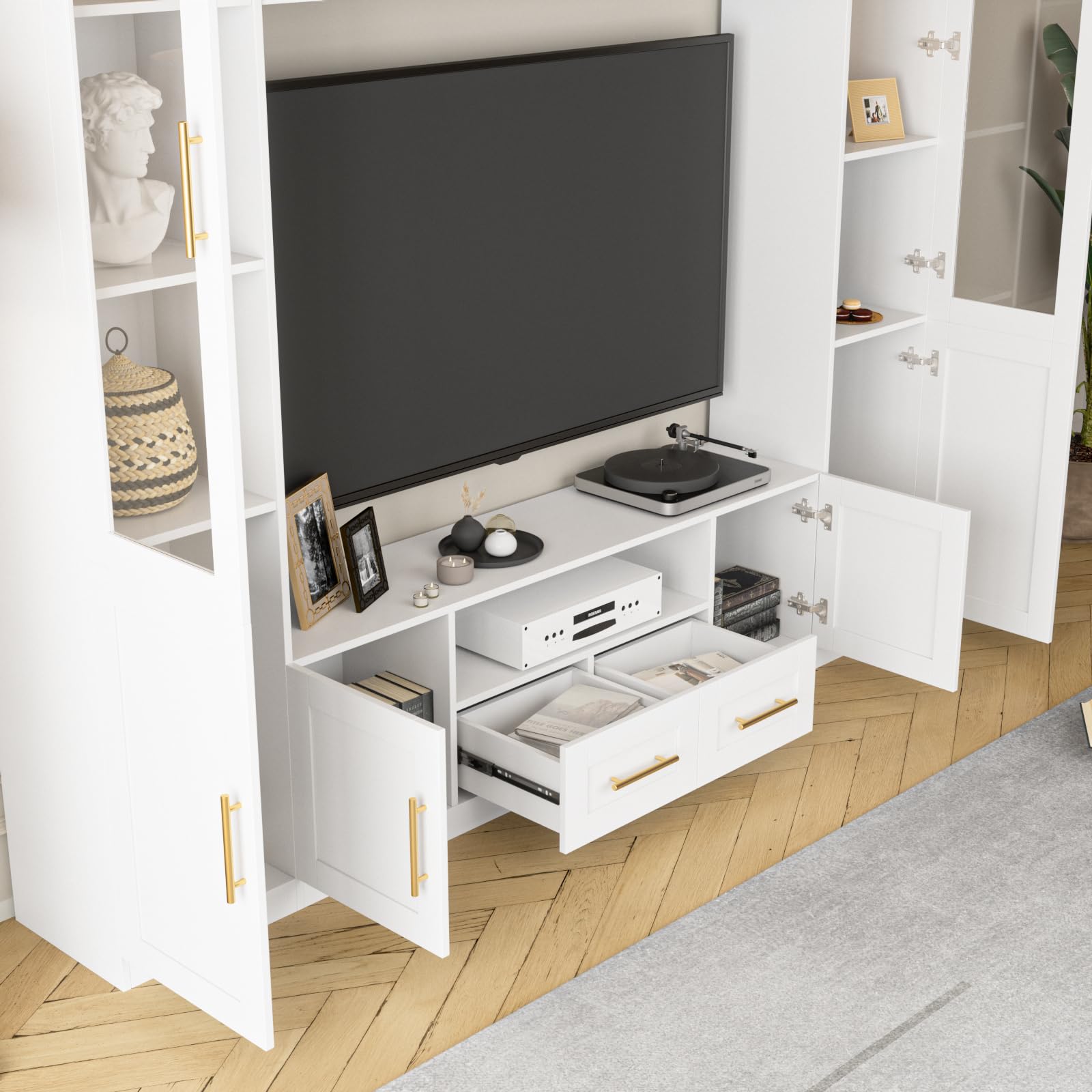 - Maximize the use of cabinet space with this multifunctional, modern, and luxurious media wall unit. This tv stand with bookshelves seamlessly combines a TV cabinet, bookshelf, wine cabinet, and display cabinet into one cohesive design, the combination of smooth lines, a pure color palette, and tempered glass exudes an understated luxury, providing a perfect visual effect. Multi-layer design allows messy objects to have their location and can meet most of the storage needs of your living room, creating your style of exquisite life.