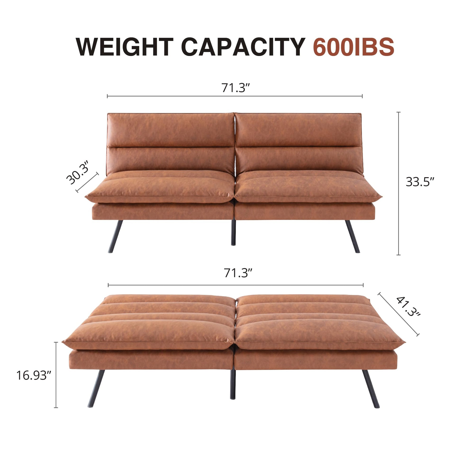 - IDEAL FOR MOST LIVING PLACE: The adjustable and compact design of this sofa bed makes it suitable for most indoor places such as office, living room, bedroom, study, etc. Futon sofa size :71 "long x 33" wide x 31.5 "high; Sleeper bed size :71" L x 42" W x 16" H; Weight Capacity:600 pounds.