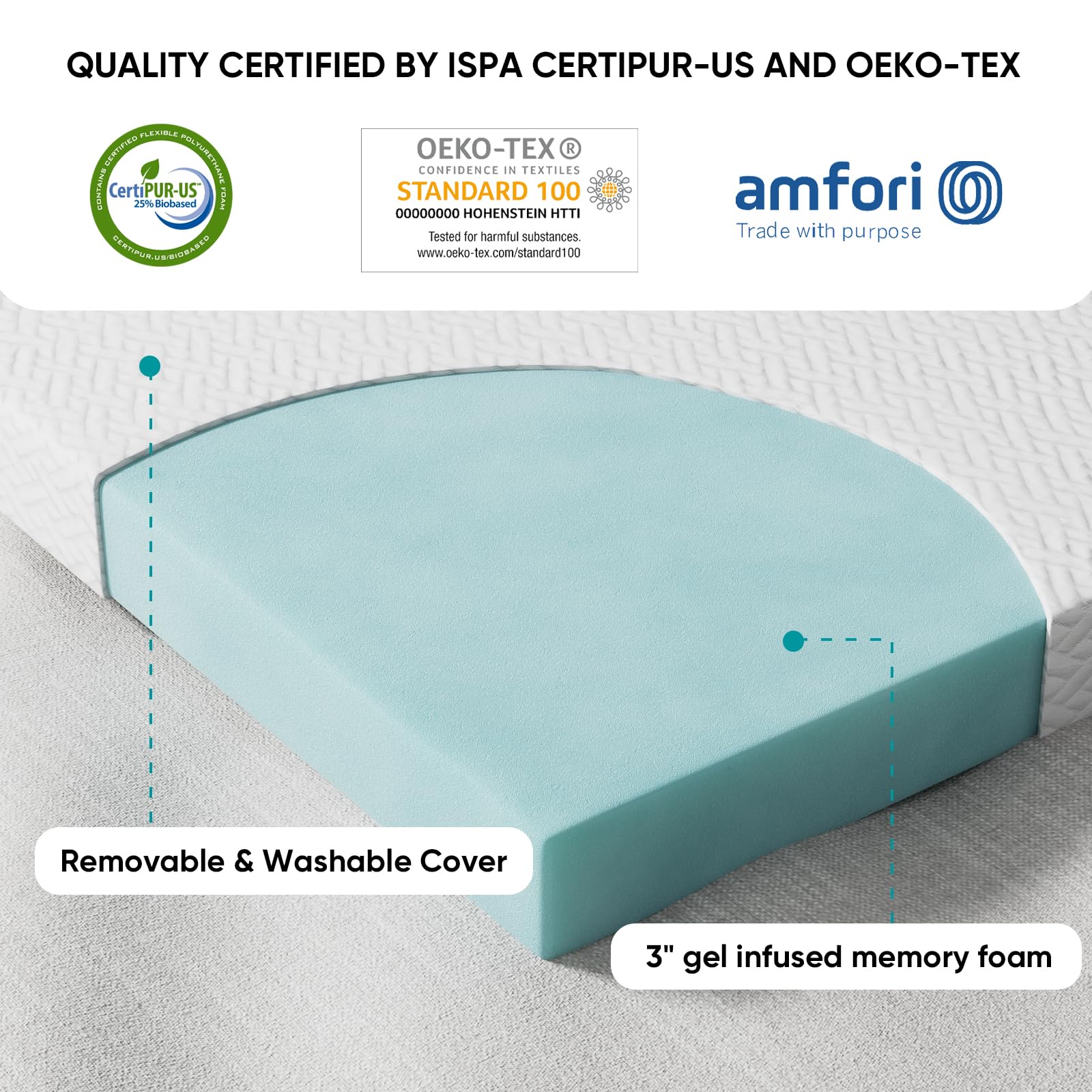 - Advanced Gel-Infused Memory Foam Our 3-inch high-density memory foam is engineered with aviation-grade memory foam infused with cooling gel beads, which absorb and disperse heat, maintaining good breathability. And the 3-inch sponge perfectly contours to your body distributes weight evenly, reduces body pressure, and effectively improves sleep quality.