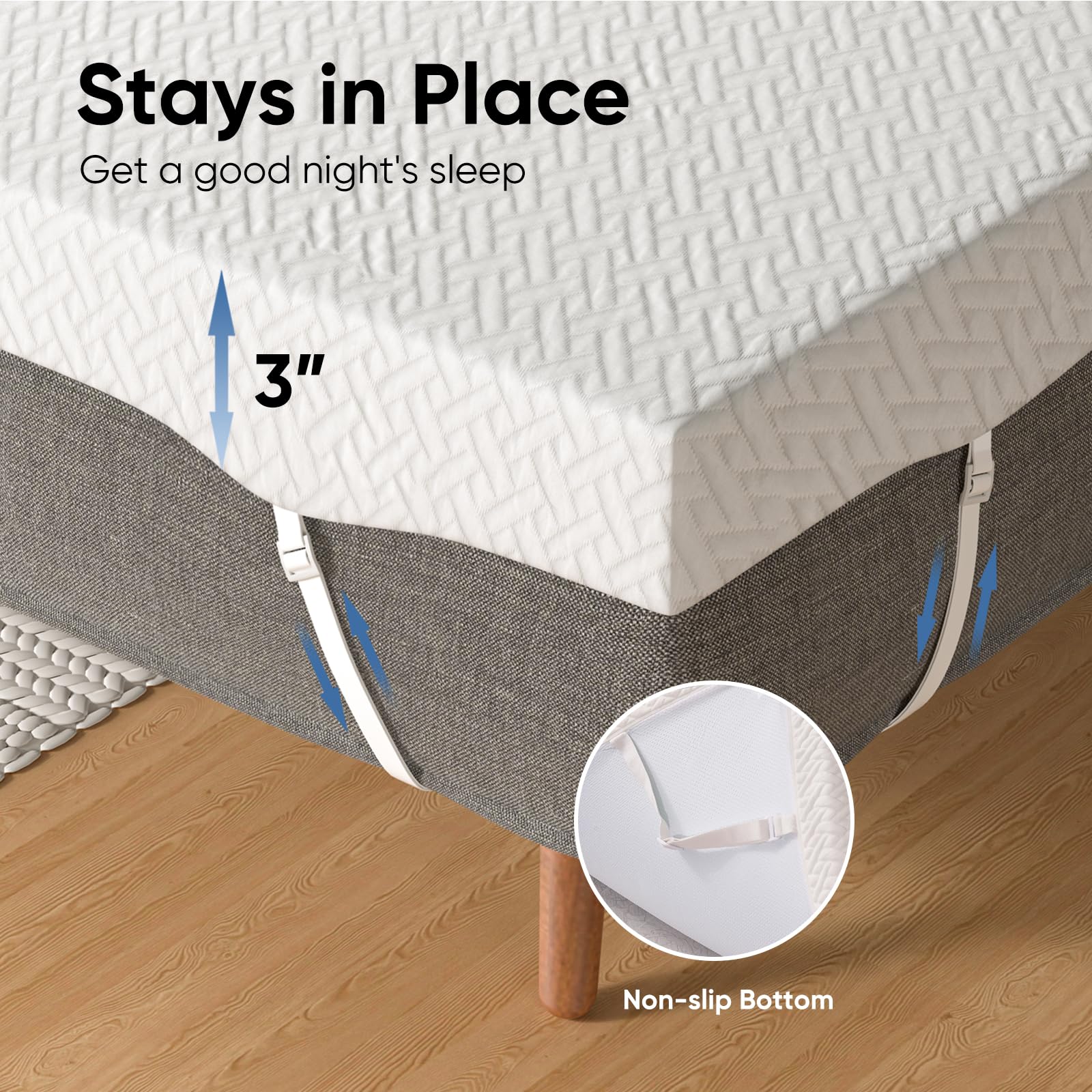 - Breathable Bamboo Cover & Anti-Slip The mattress topper features a skin-friendly and breathable bamboo fiber cover, which adopts unique weaving technology to enhance air circulation and create a cool and breathable sleep environment. Adjustable elastic straps and an anti-slip surface backing keep it securely in place, preventing any unwanted shifting. The convenient zipper closure allows for easy disassembly and washing.