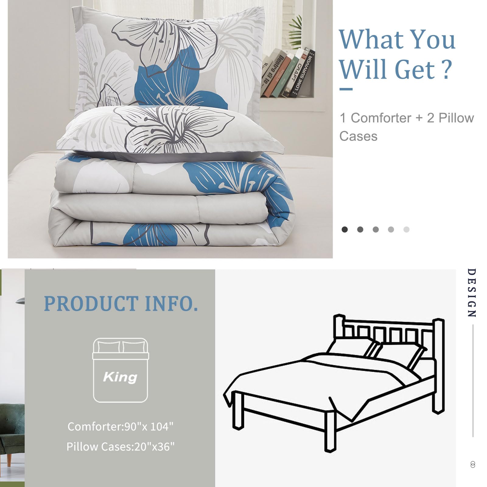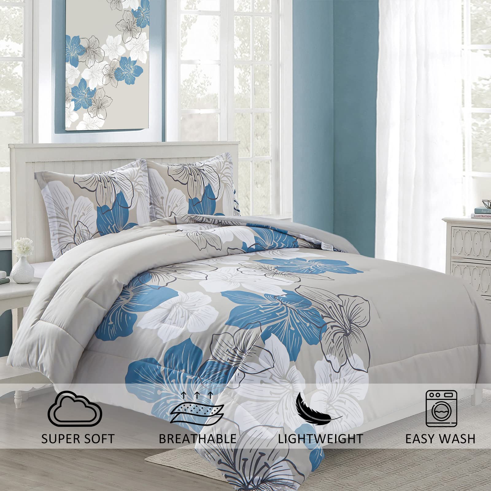 Floral Bed Comforter Set King - Blue Floral Pattern Printed on Grey