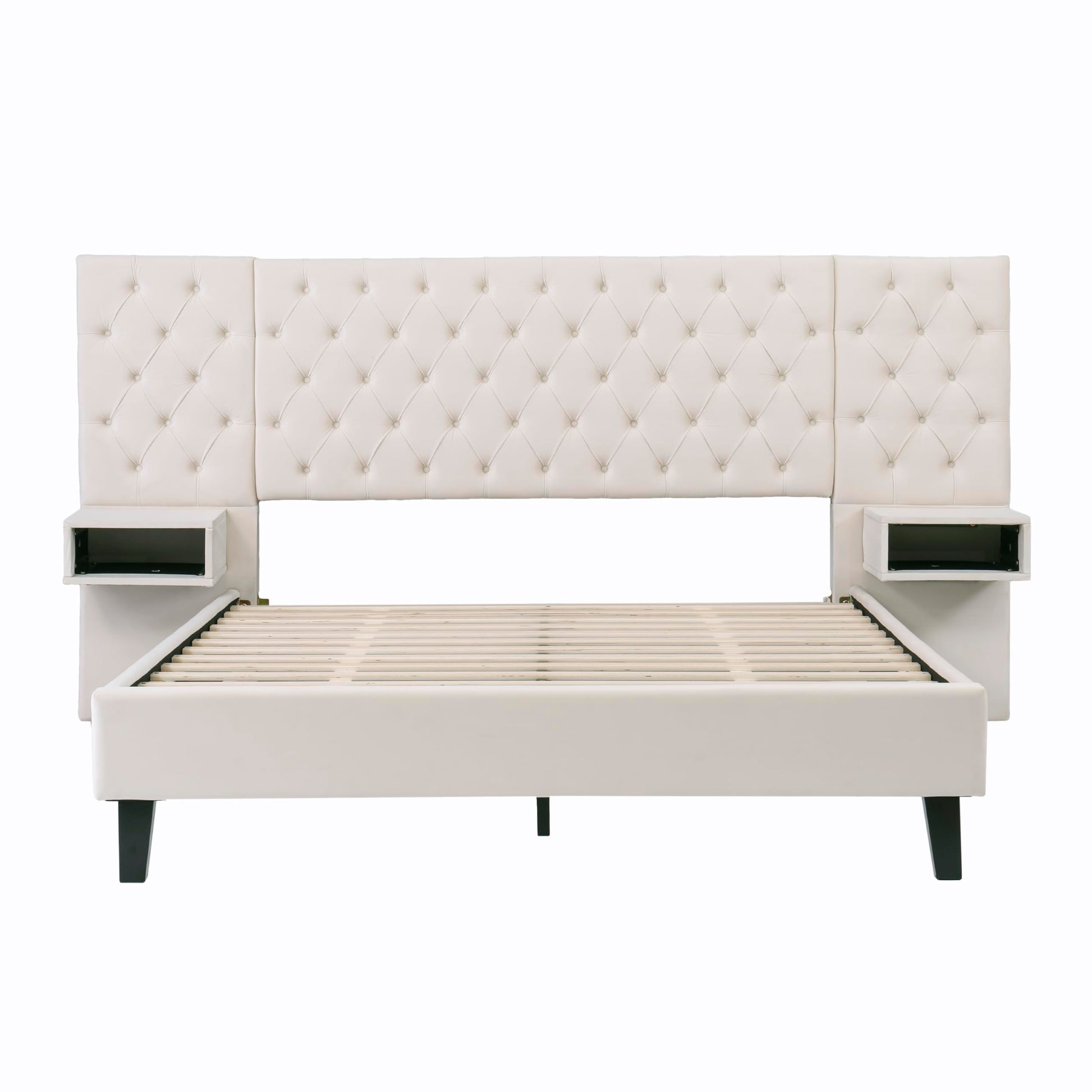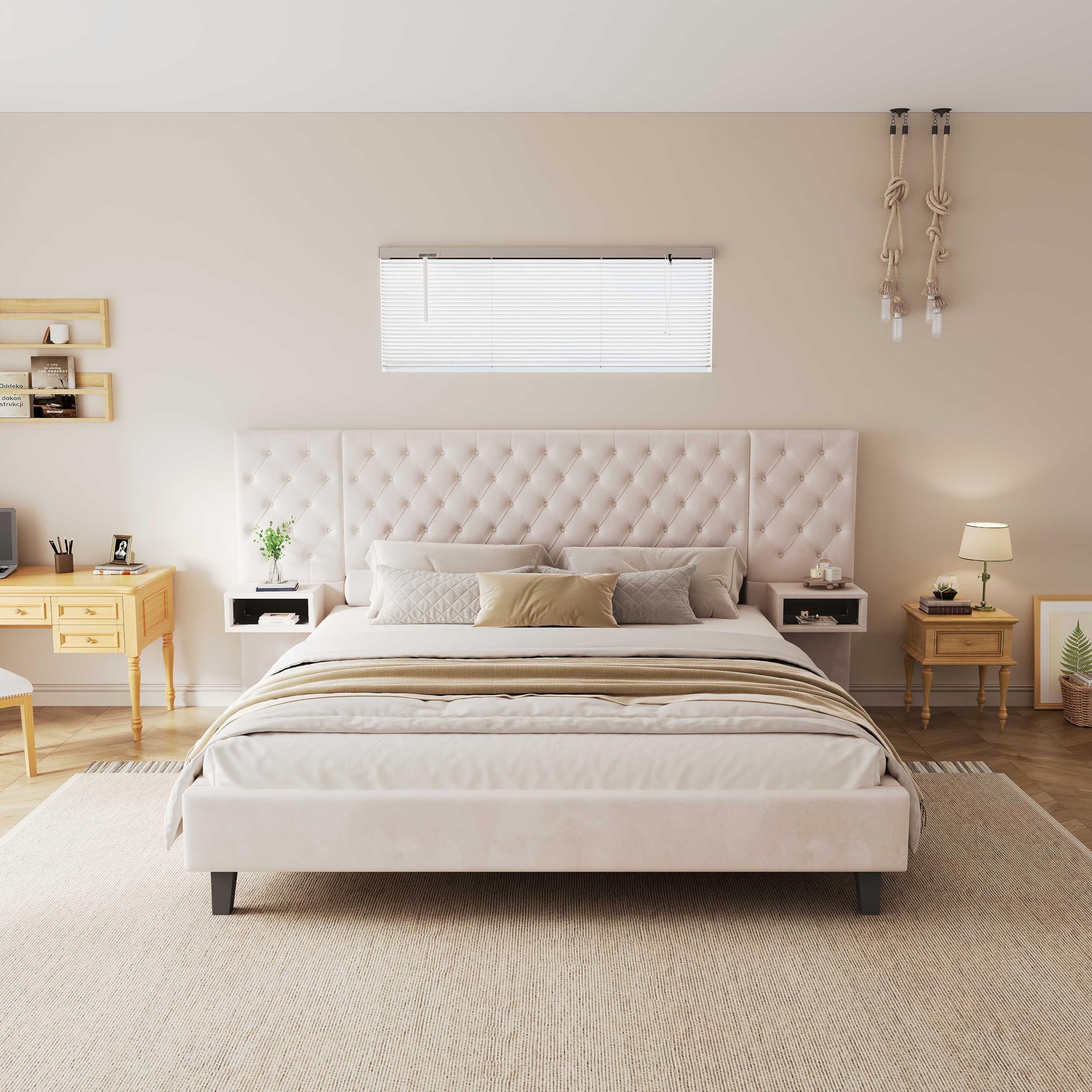 - Experience ultimate comfort and style with this platform bed. The wide, luxuriously padded headboard features deep diamond-shaped button tufting, adding a touch of elegance. Integrated bedside cabinets offer convenient storage for your essentials. Transform your bedroom into a sophisticated and practical retreat.