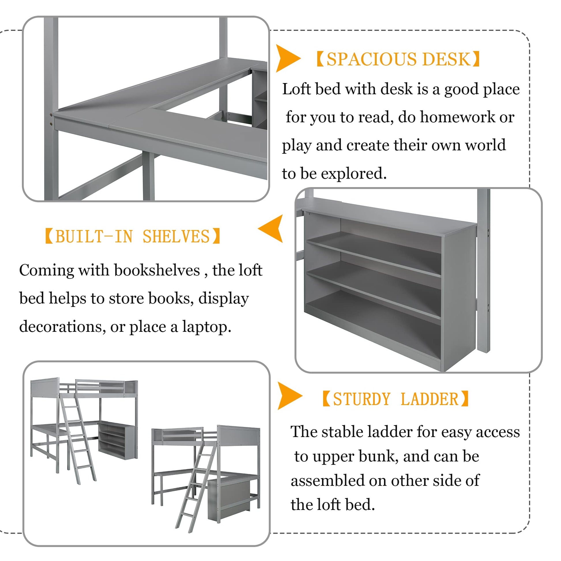 Loft Bed, Full Loft Bed with Desk and Shelves, Wooden Loft Bed Full with Desk Underneath