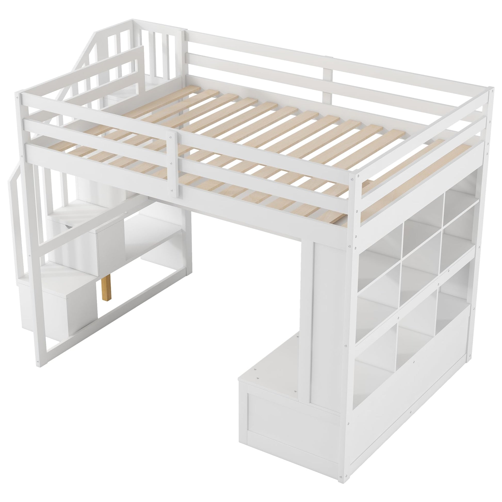 Size Loft Bed with Desk and Storage Stairs, Wood Loft Bed Full with Shelves & 2 Storage