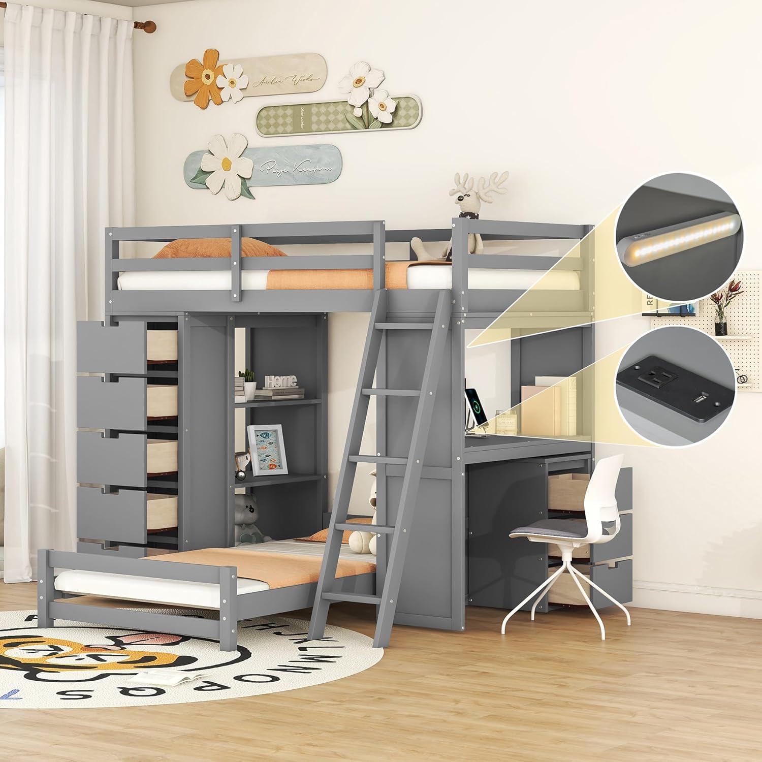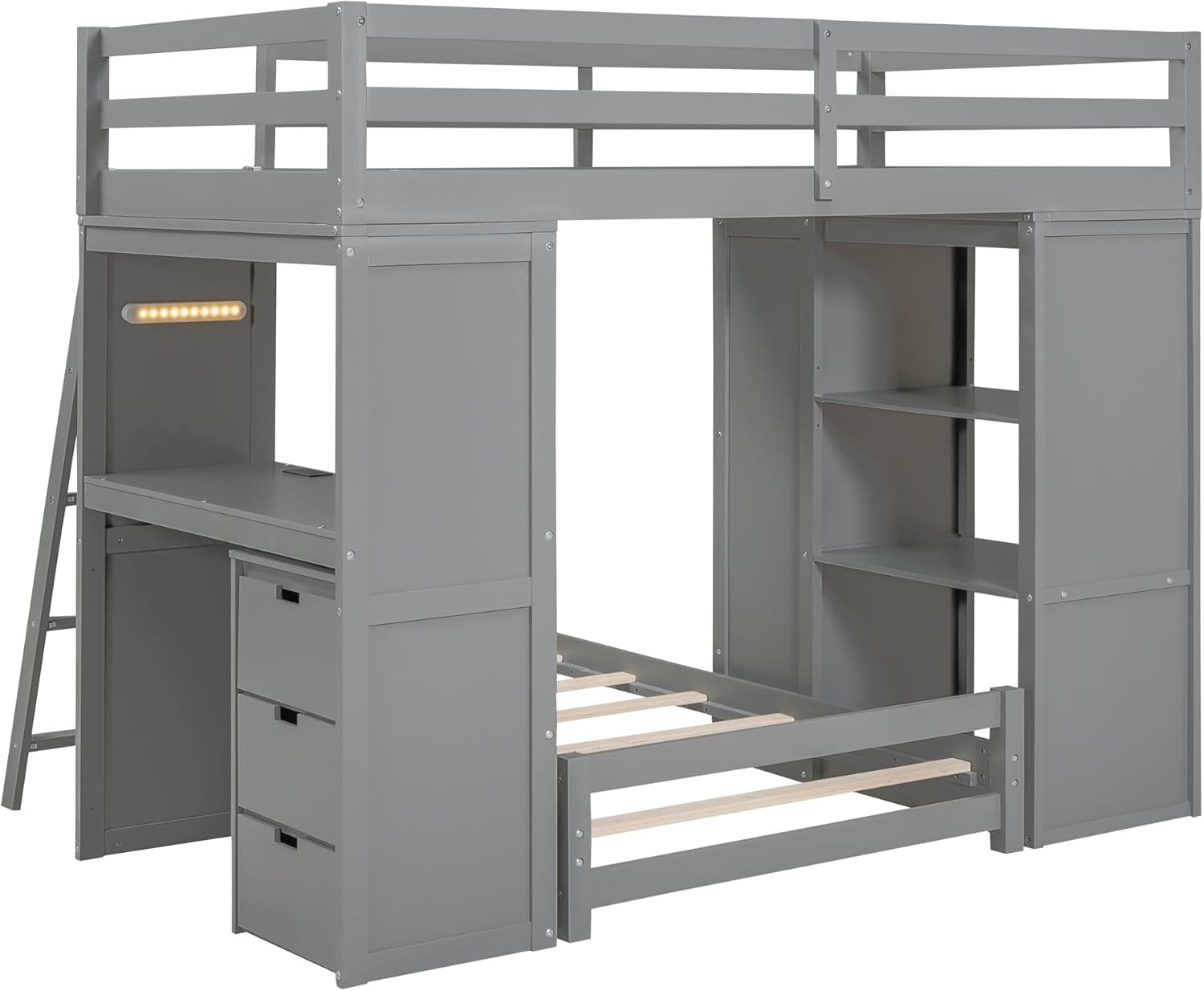 Over Twin Bunk Bed Loft Bed with Desk/ 8 Drawers/ 3 Shelves/Stairs/LED Light and USB
