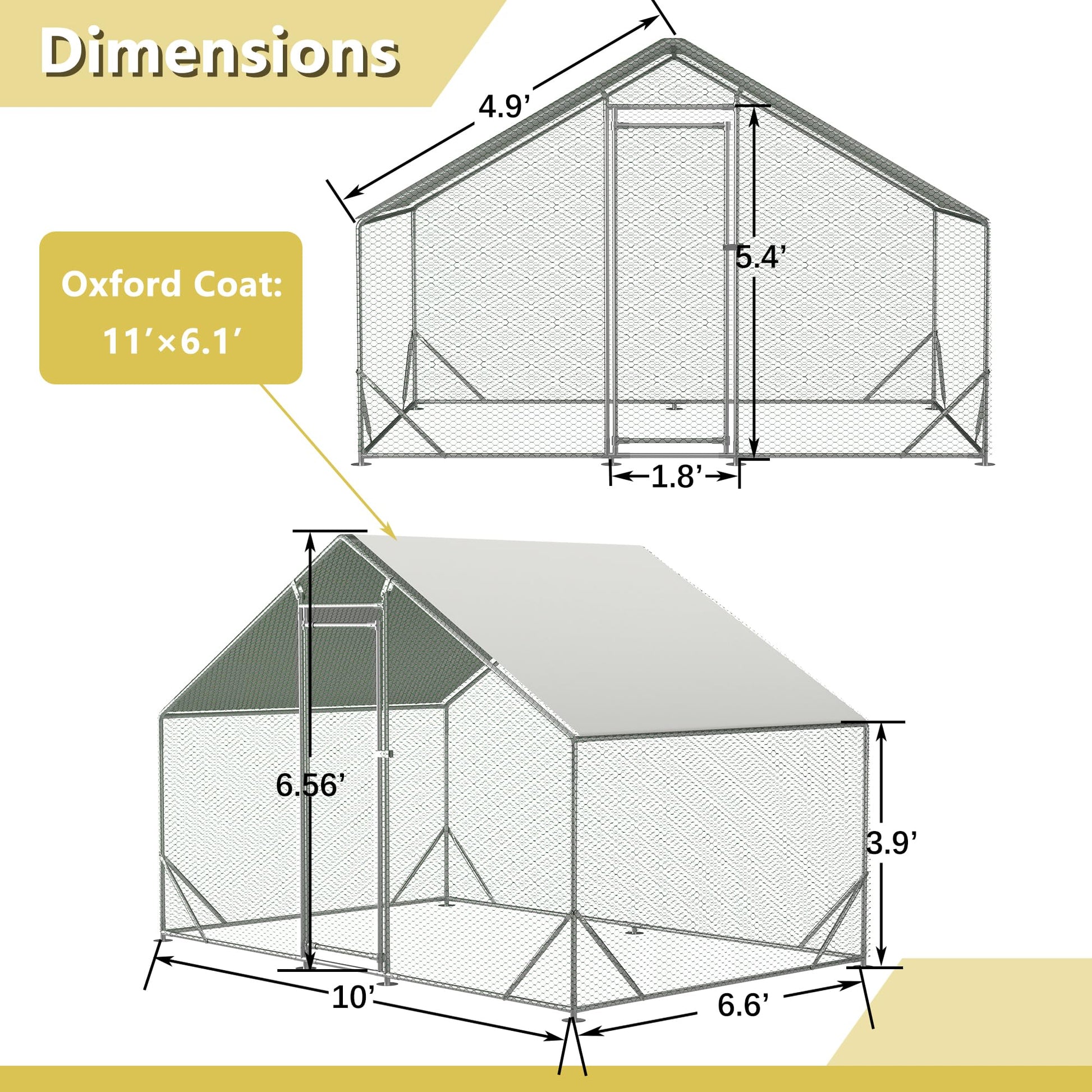 - We offer you four sizes to meet different request:10x6.6x6.56ft / 13x10x6.56ft / 20x10x6.56ft / 26x10x6.56ft. Our walk In Chicken Run is designed with convenience in mind. With a height of 6.56 feet, it allows easy access for adults to enter and exit effortlessly. Enjoy a spacious and user-friendly environment for both you and your feathered friends.