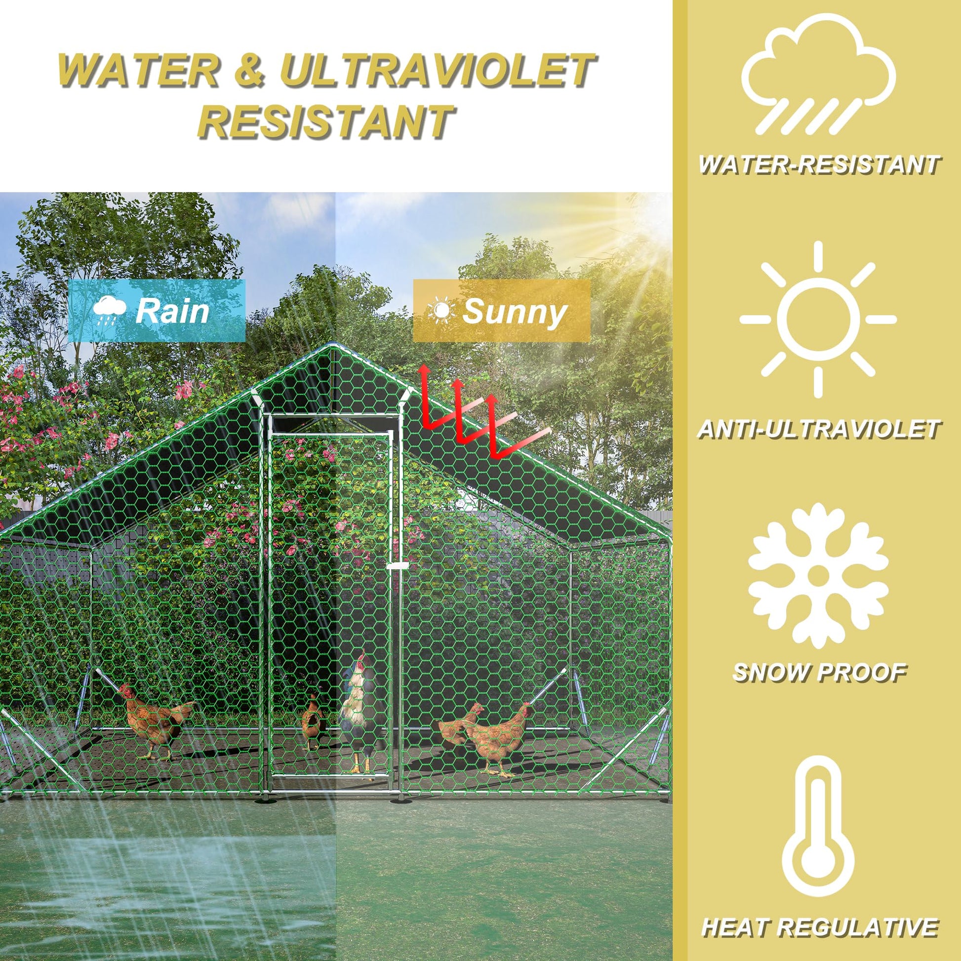 - The chicken coop uses a high-quality steel pipe frame, coupled with galvanizing technology, don't worry about rusting in outdoor. The steel pipe is strong and stable enough in windy and heavy rain.