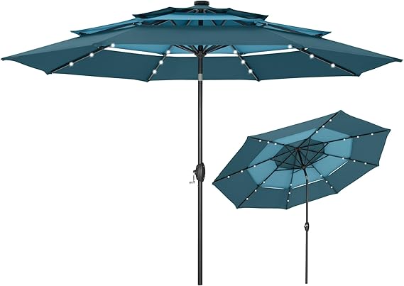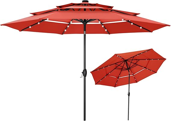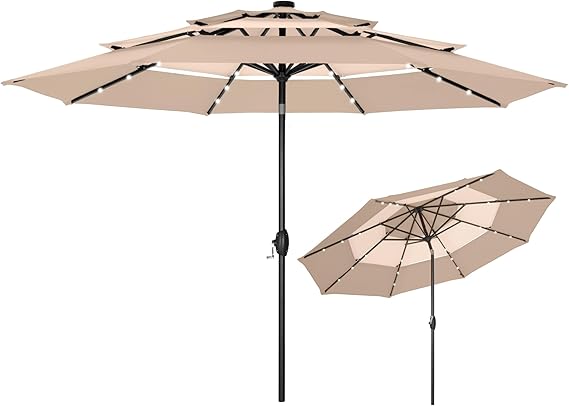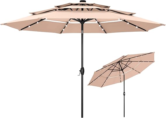 10ft 3 Tier Solar Patio Umbrella, Outdoor Market Umbrellas with 24 LED Lights