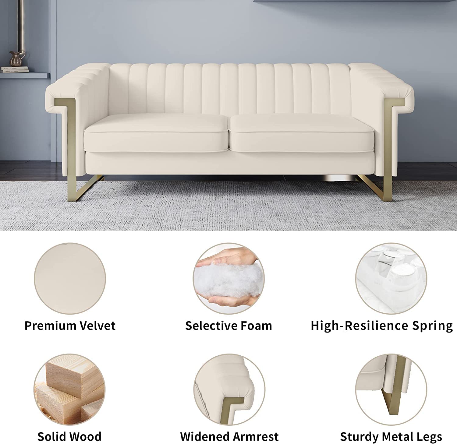 - IVING ROOM SOFA - Suiting homes and apartments, this luxury sofa complements mid-century, modern, glam deco, and contemporary décor. Sofa: 86.64*30.71*30.51inch(L*W*H); Weight Limit: 800 lbs