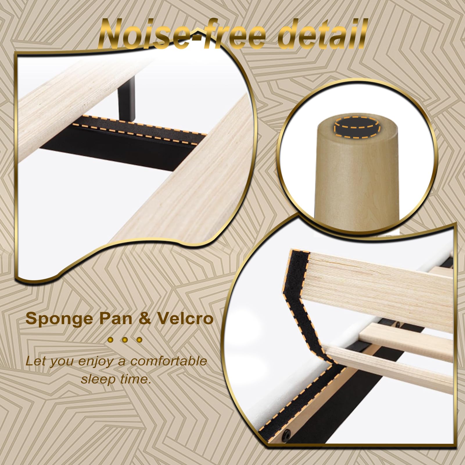 - Sturdy & Noiseless The bed frame is made of wood frame structure, a series of evenly-spaced solid wood slats, and center support legs to provide dense and strong support for up to 800lbs, your kids and pets can play freely on it without any worries.EVA padded tape and velcro wood slats for non-slip and noise-free use