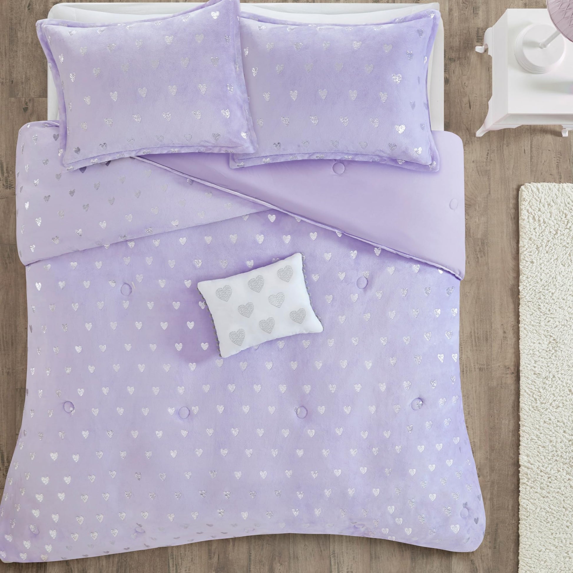 Comforter Set for, Ultra-Soft Microlight Plush Metallic Printed Hearts Brushed Reverse Overfilled Down