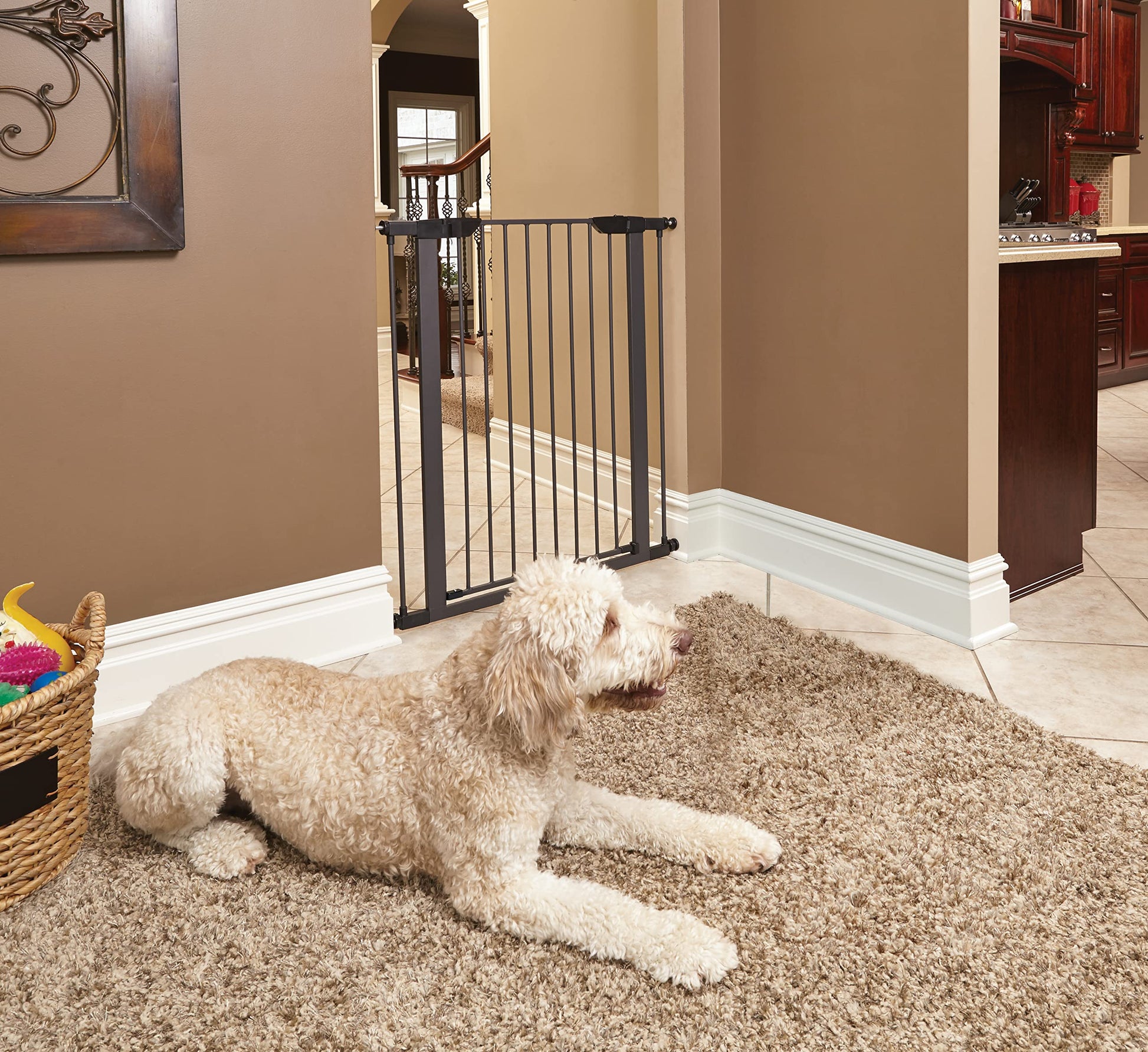 - Pet gate includes 4 pressure gate mounts for easy & secure installation, 2 additional 3" extensions & hardware for installation. Pet gate includes 1 year Manufacturer's Warranty