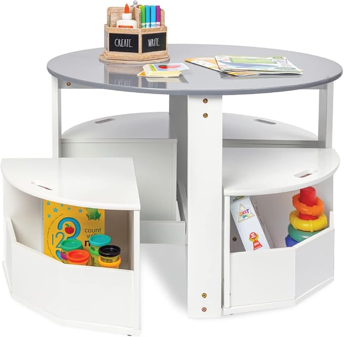 Toddler Table and Chair Set – Round Kids Activity Table with 4 Storage Stools, Nesting Design for Toddlers