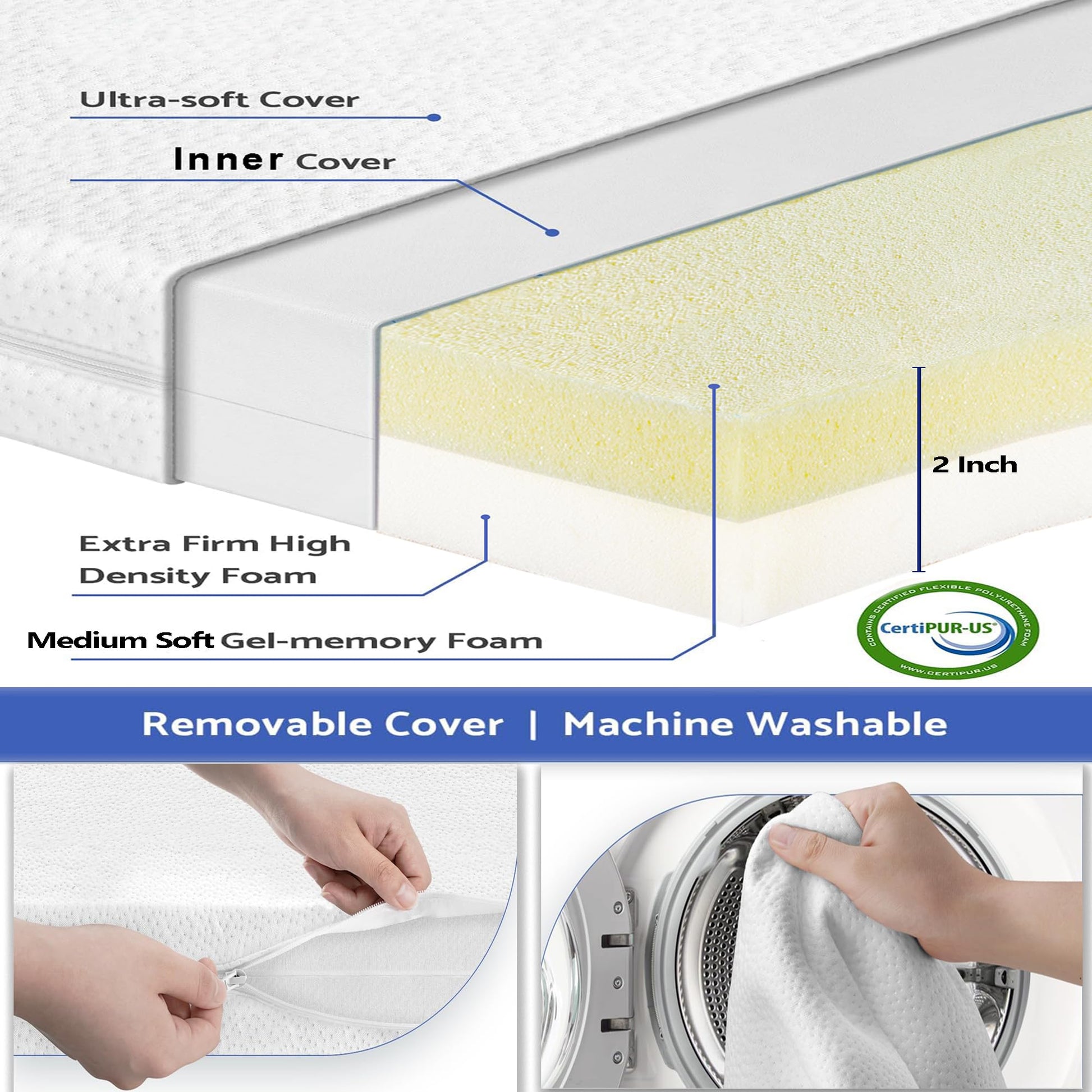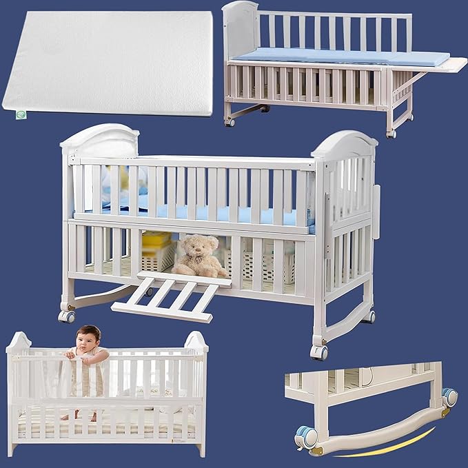 - [ 2024 Convertible Crib 4 in1 Upgrade cunas para bebes] With 2 inch thick memory foam mattress (38L*24W) certified by CertiPUR US and OEKO-TEX STANDARD 100, free from harmful substances. Double-sided design cares for spine health. Firmer foam side: High-elastic foam provides optimum firmness for the baby's development, avoiding the risk of spinal deformities. Memory foam side:Memory foam fits the spine of toddlers, dispersing the weight of bodies, and correcting the child's poor sleeping position.