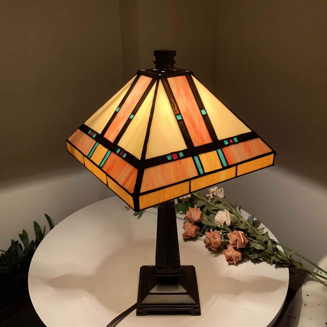 Elevate your home décor with this stunning Mission-style stained glass table lamp. Featuring intricate handcrafted glass panels in warm amber and brown tones, this decorative lighting piece brings timeless elegance and ambient illumination to any living room, bedroom, or office space.