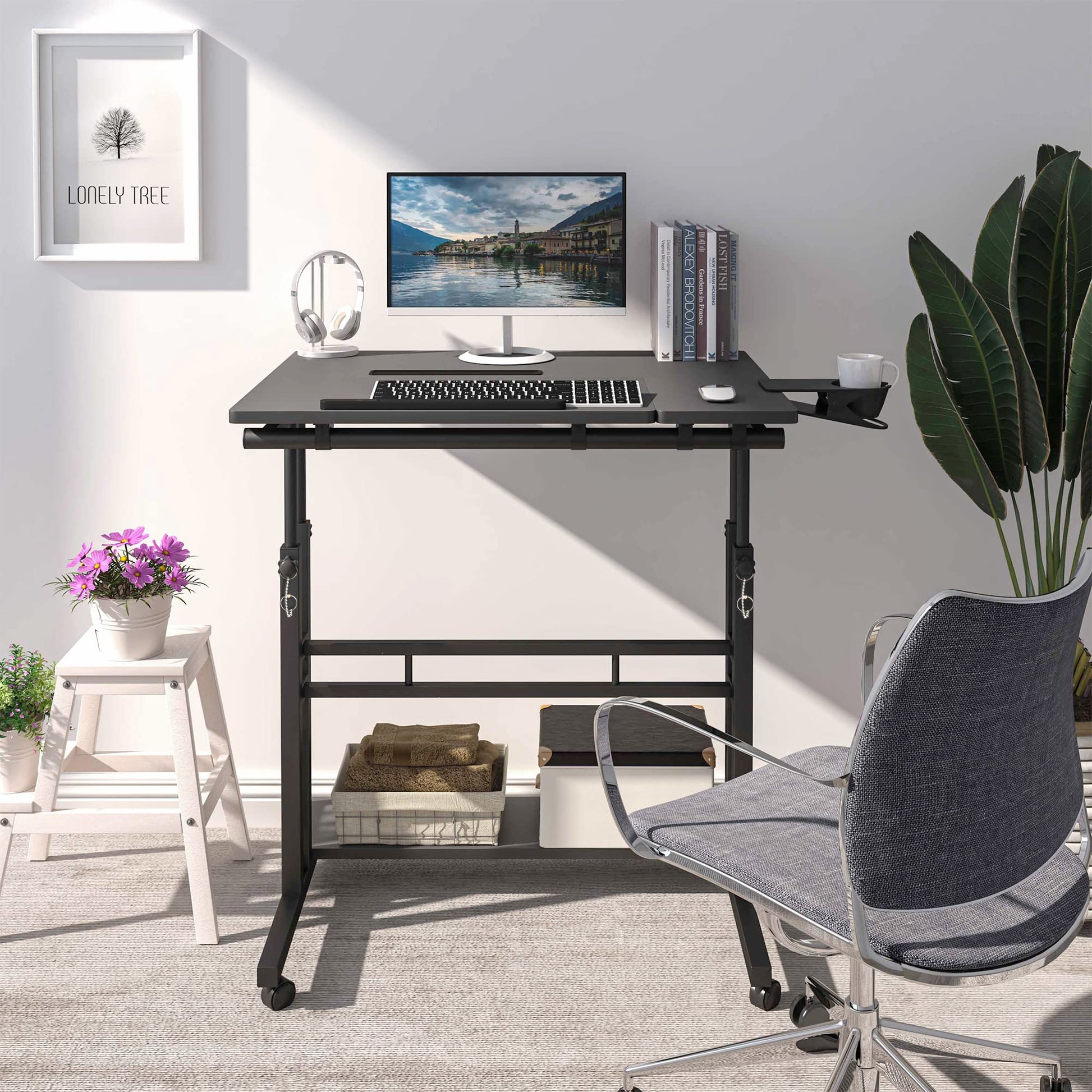 - Standing and Sitting 2 Modes: Mobile stand up desk height can be adjusted from 26.9 to 46.8 inches as you wish; Changing between sitting and standing avoids health problems of a long time sitting; Rolling table has a desk cup holder and 2 L shaped hooks