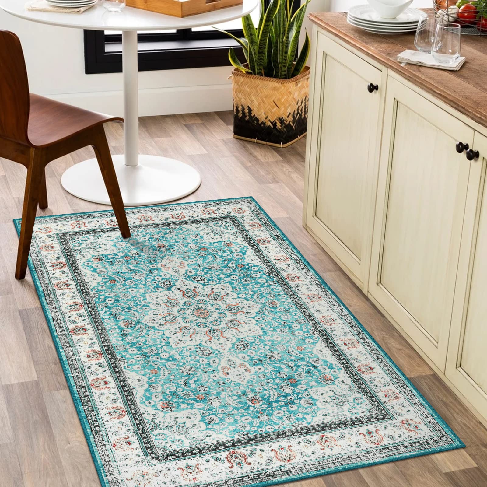 Moespace Oriental Area Rug - 3x5 Washable Rug Boho Non-Slip Indoor Rug for Kitchen Entryway, Low-Pile Front Door Mat Print Distressed Accent Rug for Bedroom Foyer Laundry Sink, Turquoise