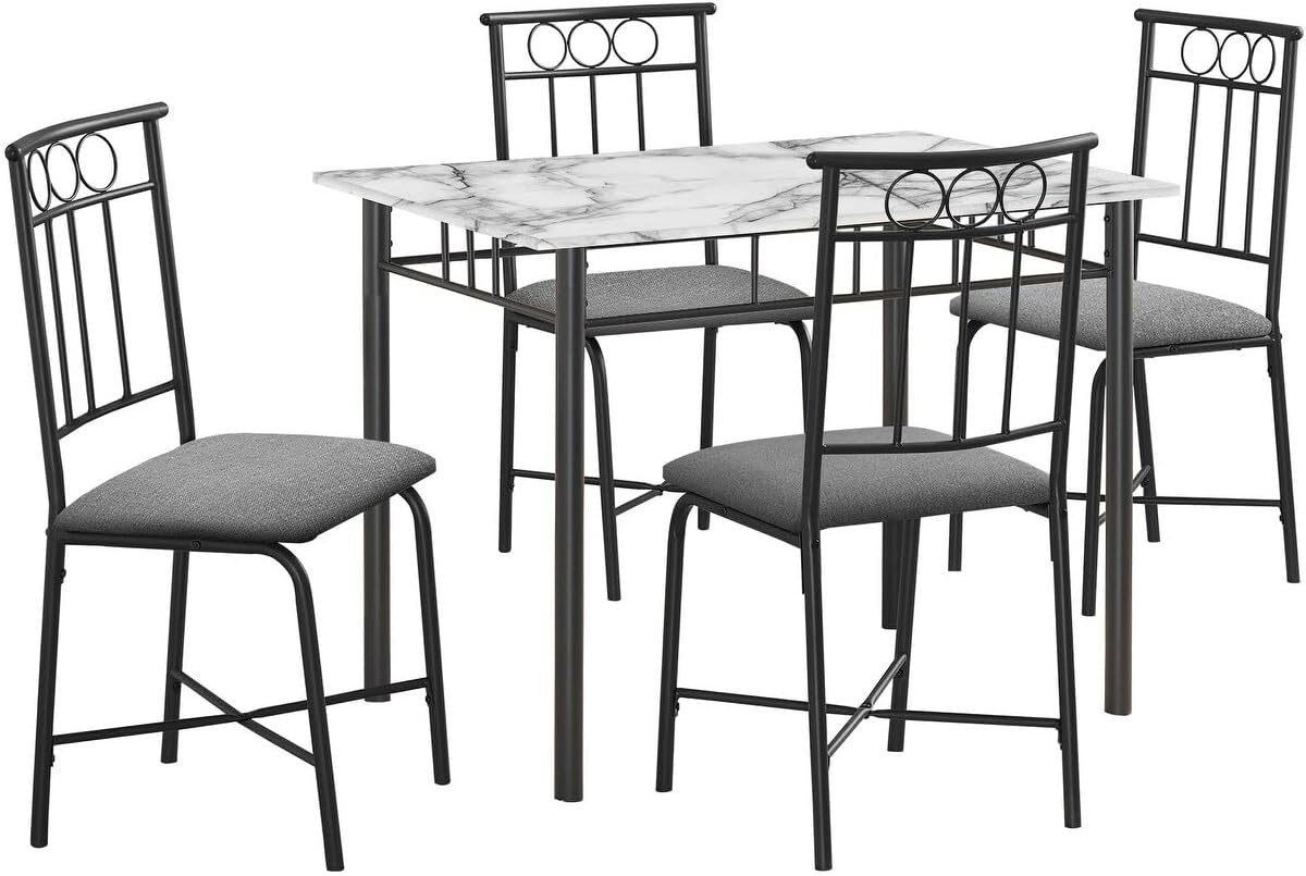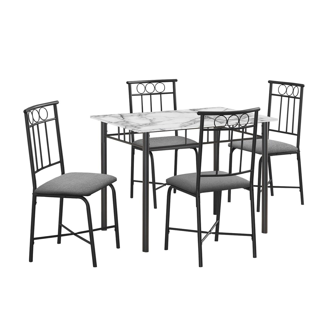 Details: This contemporary 5 piece dining table set is the perfect fit for a small kitchen or casual family dining space, comfortably seating up to 4 people. The 40 rectangular table is composed of a stylish, easy to clean, white marble look laminate top, supported by black metal legs made with sturdy construction. The armless chairs come upholstered in a fashionable grey cotton and linen mix fabric for comfortable seating at the table. Easy to assemble, with all hardware and illustrated instructions included so you can set up and enjoy this stylish set without too much effort. With its 2 year limited warranty for manufacturer s defects, you can rest assure this dining table set with a space saving design will last through many memorable meals.
