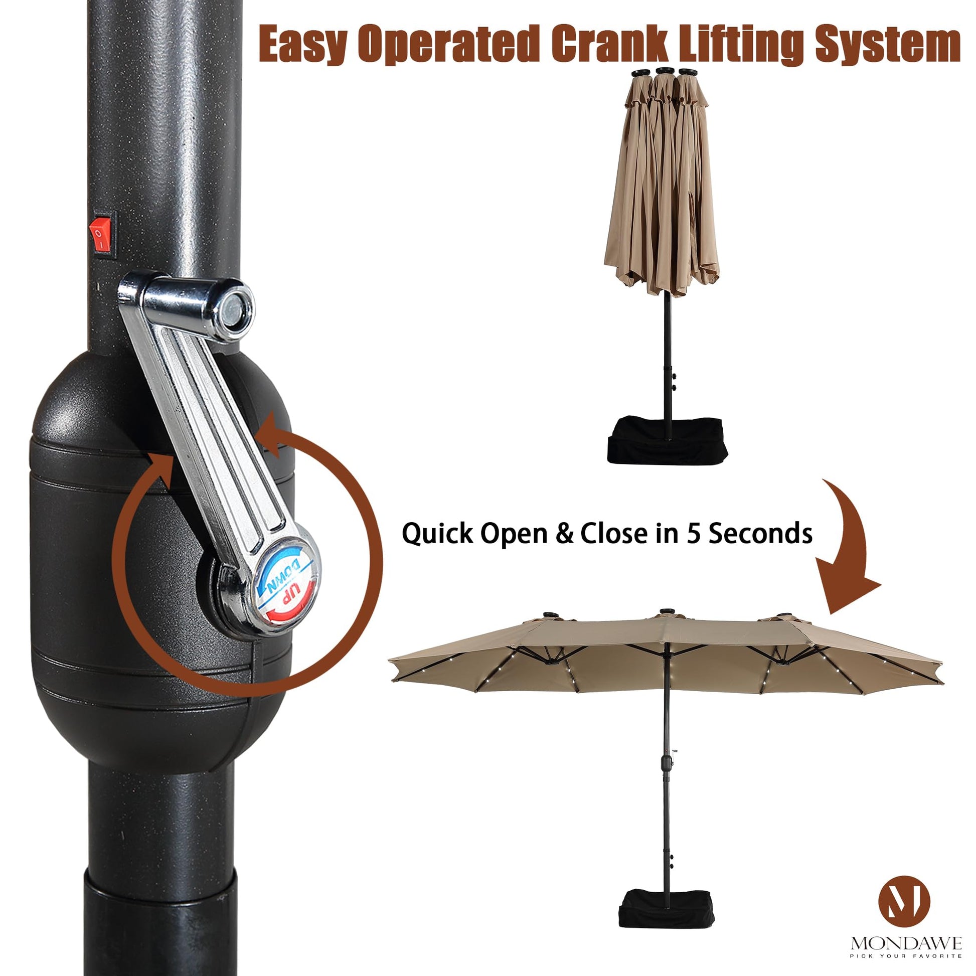 - Large outdoor umbrella designed with crank mechanism, convenient to open and close. Including all the accessories needed for simple installation, very easy to assemble and use. Comes with an umbrella base set, 2 sanbags included (Fill with sand before use)