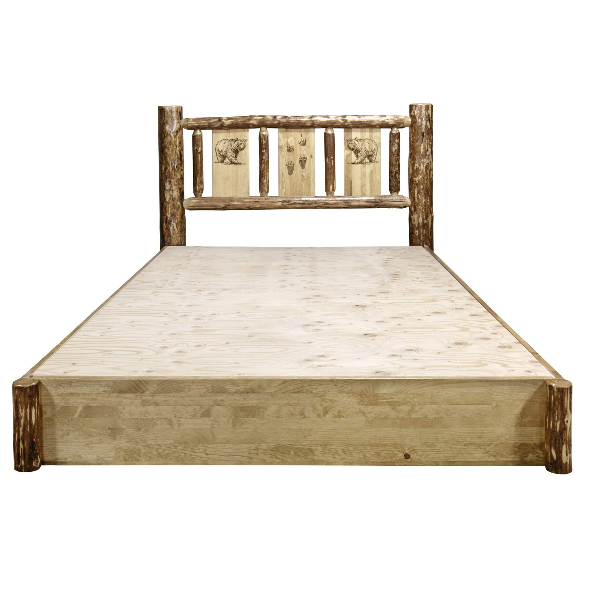 - Featuring a rustic themed, laser engraved three panel headboard with a unique motif and 6 under-bed drawers of storage, this king-sized log platform bed will add a sense of practical style to your bedroom