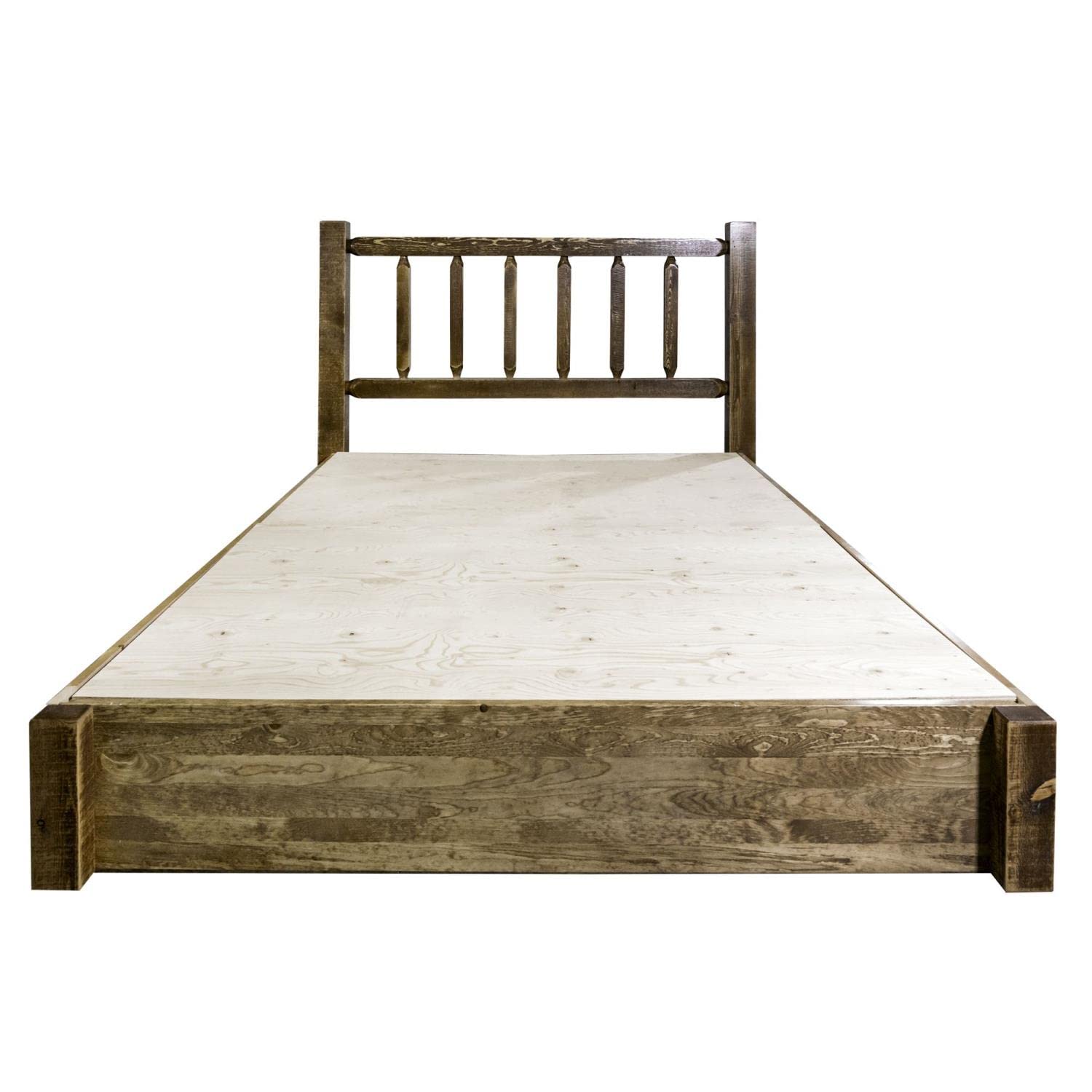 Details: From Montana Woodworks, the largest manufacturer of handcrafted, heirloom quality rustic furnishings in America comes the Homestead Collection line of furniture products. Handcrafted in the mountains of Montana using solid, American grown wood, the artisans rough saw all the timbers and accessory trim pieces for a look uniquely reminiscent of the timber-framed homes once found on the American frontier. This unique combination of sleek platform bed and under bed storage features six full sized, 21" wide, 16" deep and 5.5" high drawers mounted on epoxy coated steel slides for years of practical, trouble free use. Comes professionally pre-finished with premium grade stain and semi-gloss clear lacquer. Featuring a low height (15") footboard and standard height (47") headboard, this bed is rated at a capacity of 550 pounds. Some assembly required. Instructions and hardware included. No mattress support or box spring is required. 20-year limited manufacturer's warranty at no additional charge. Hand crafted in Montana U.S.A. using genuine lodge pole pine.