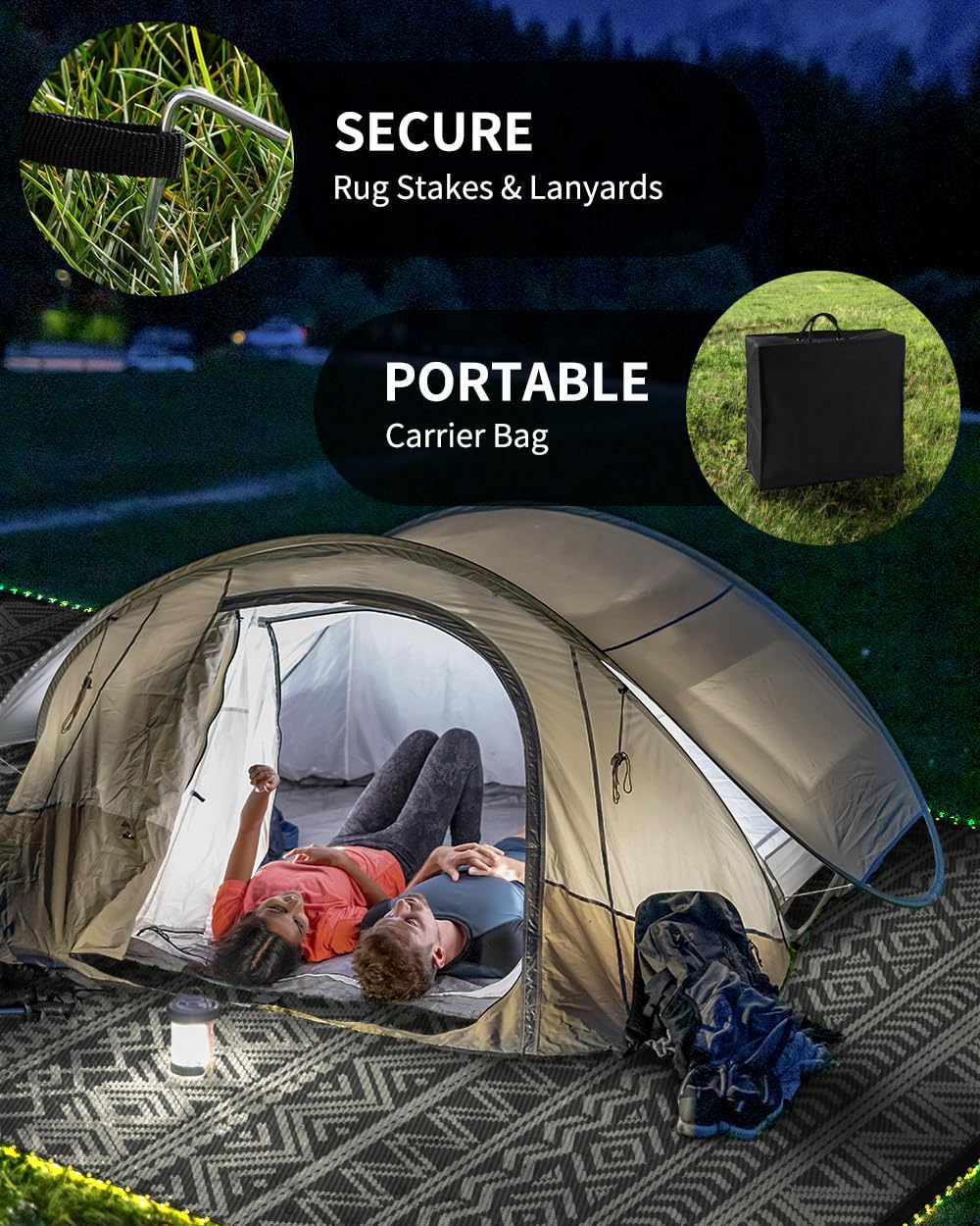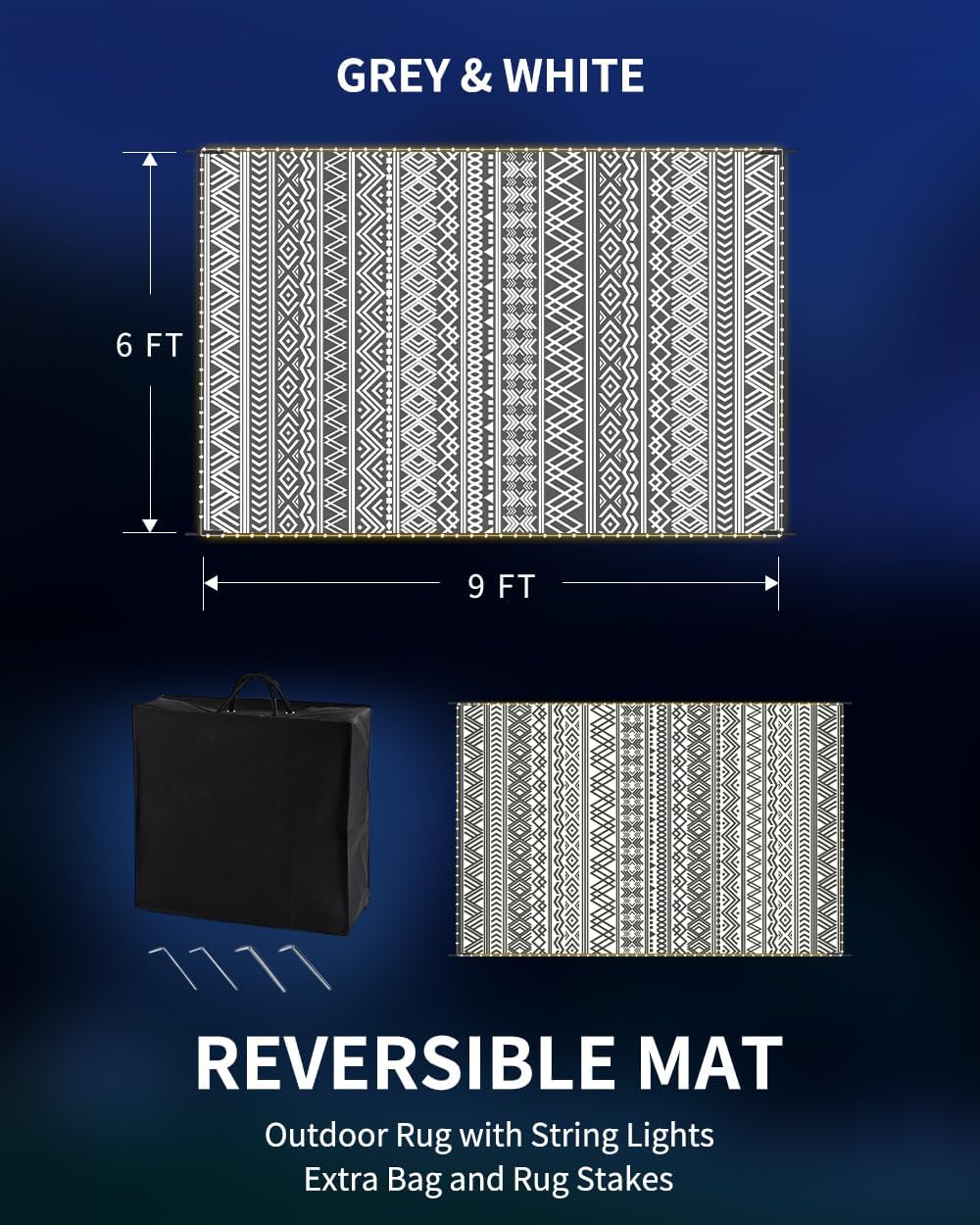 - Reversible&Versatile: A budget-friendly two-tone reversible mat is a great outdoor decor for patio and outdoor camping. Modern, versatile and sleek geometric design offers color and personality to your indoor outdoor space. Extra strip lights spruce up the dankness with romance.