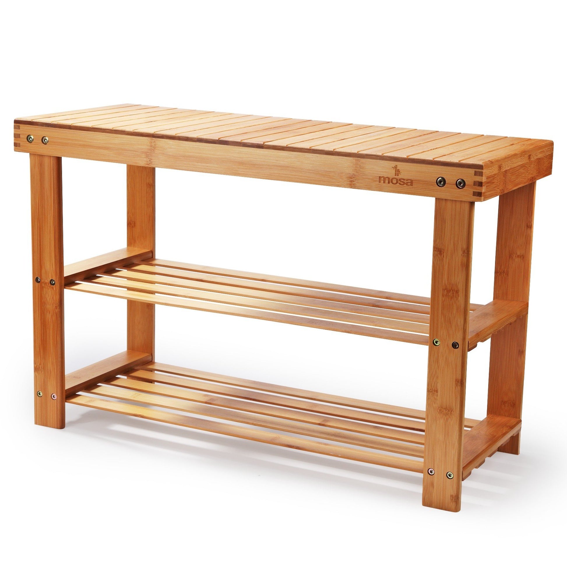 - 2 tiers bamboo rack and storage bench for shoes, bags, plants, toiletries, baskets in entryway, bedroom, bathroom, closet, etc.