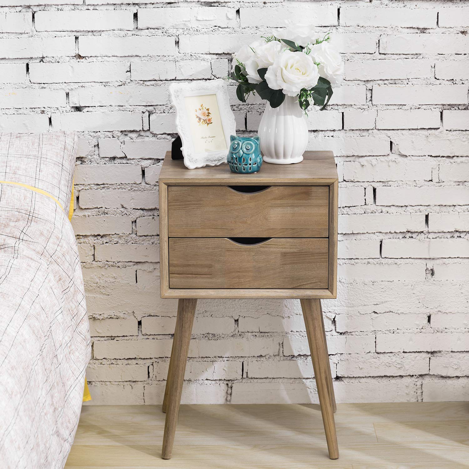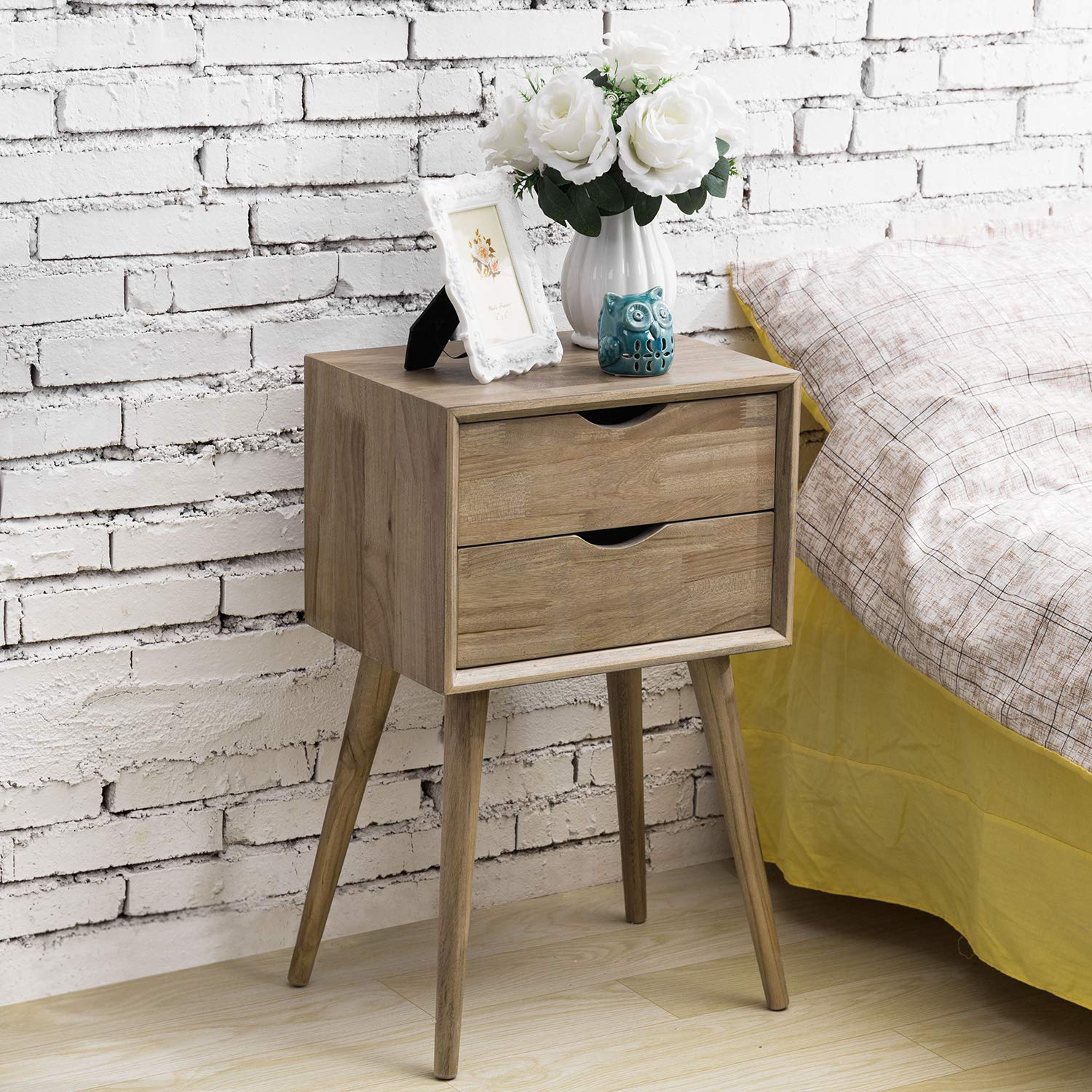 Solid Brown Wood Mid Century Modern Nightstand Side Table End Table with 2 Pull Out