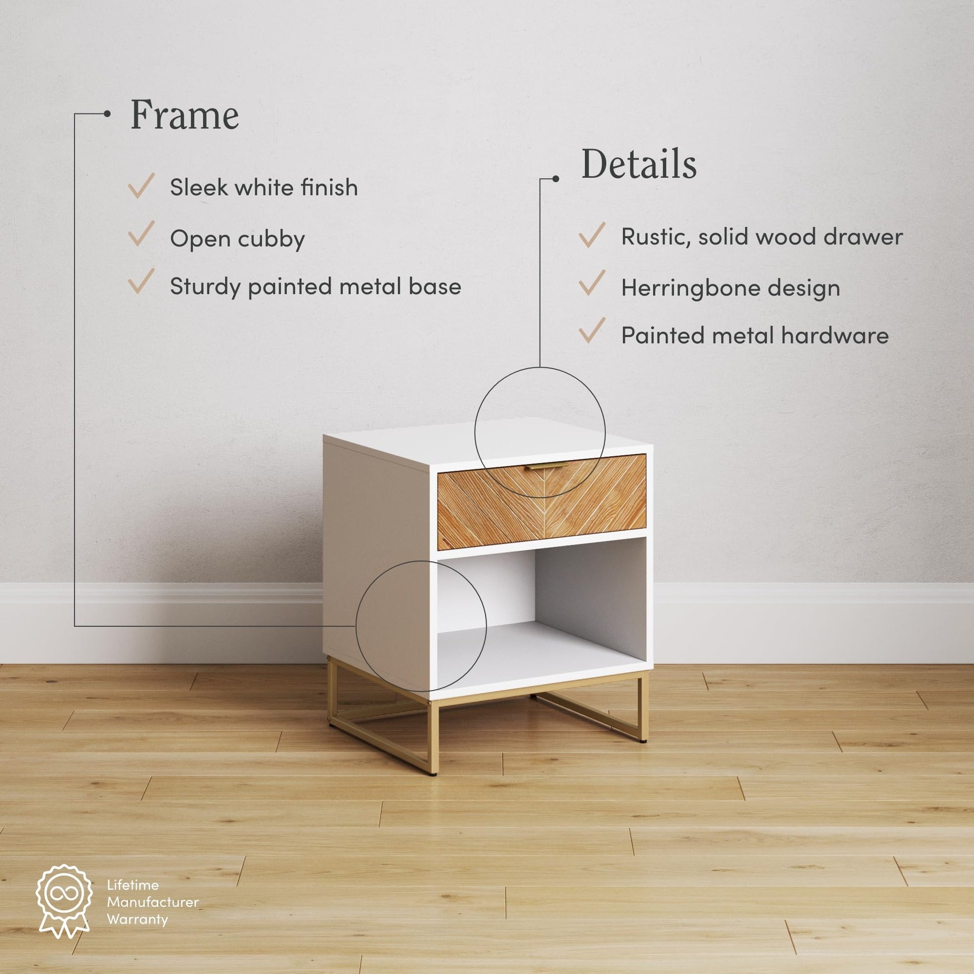 - Kensi white side table has a unique and elegant design with its natural wood finish drawer decorated in a sleek, elegant herringbone design and a matte white paper frame. Add a chic touch to this piece with the light gold powder-coated legs that have footpads attached to keep your floors from being scratched..Assembly Required.Material:Engineered Wood