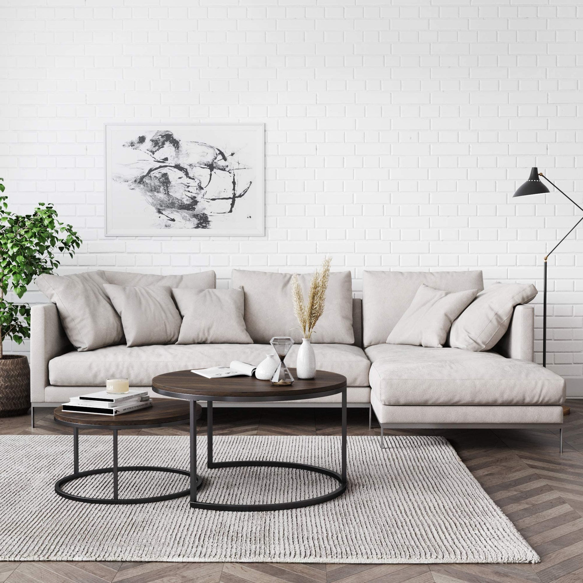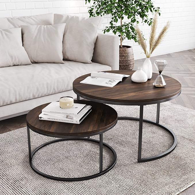 - This nesting coffee table's warm nutmeg wood finish and sturdy metal base will complement any living room décor.