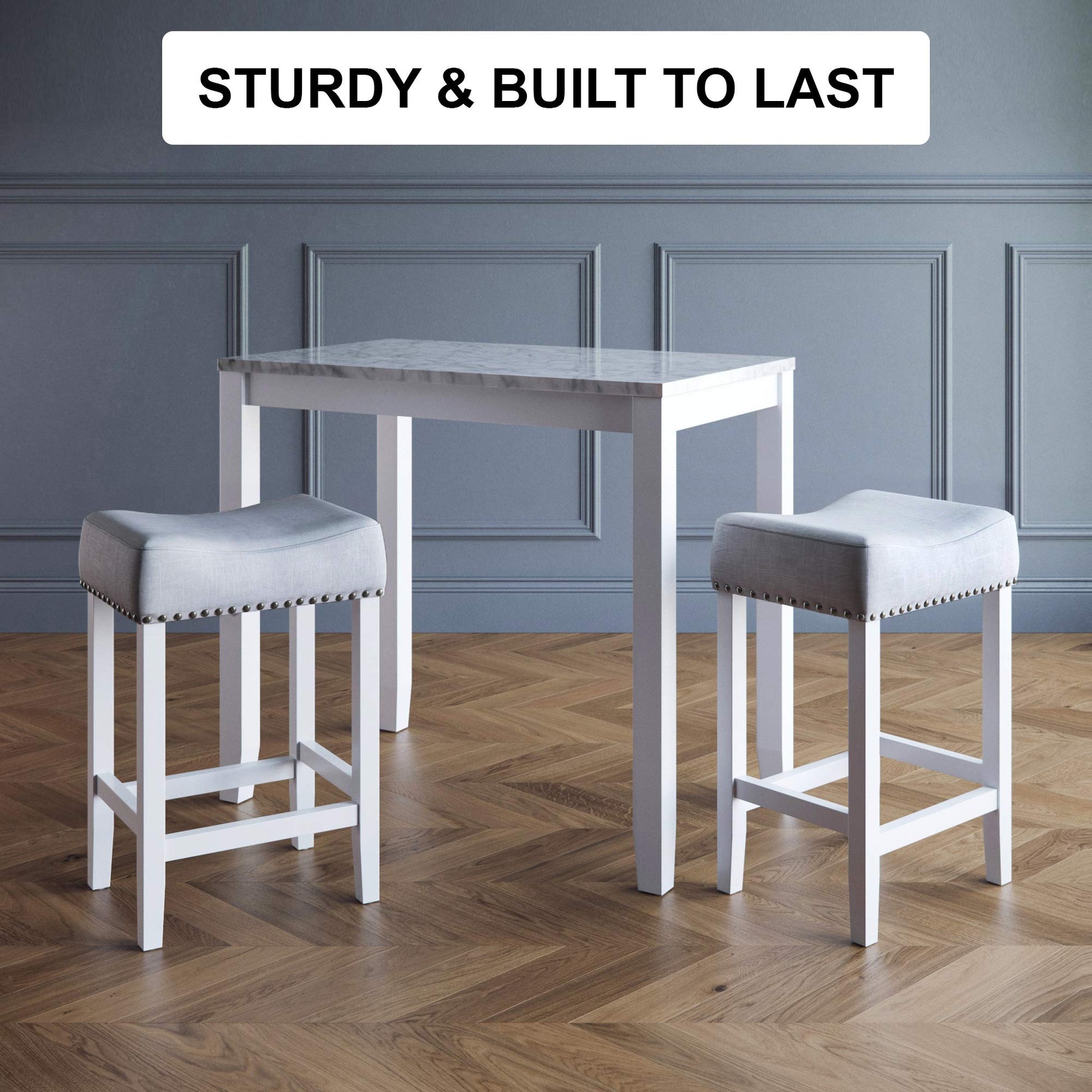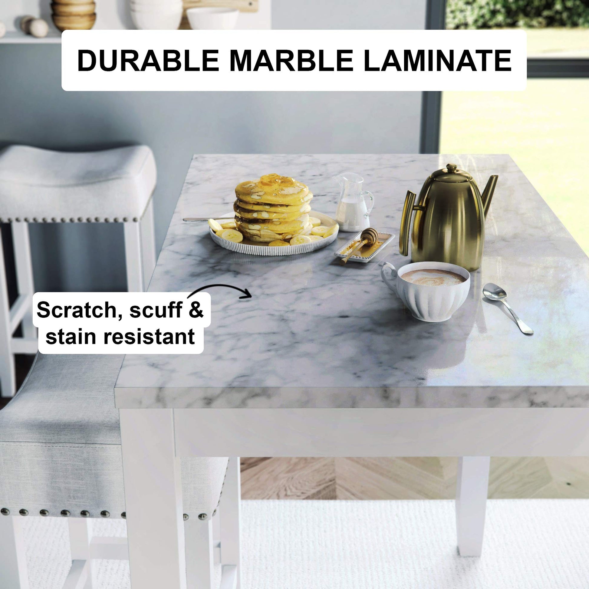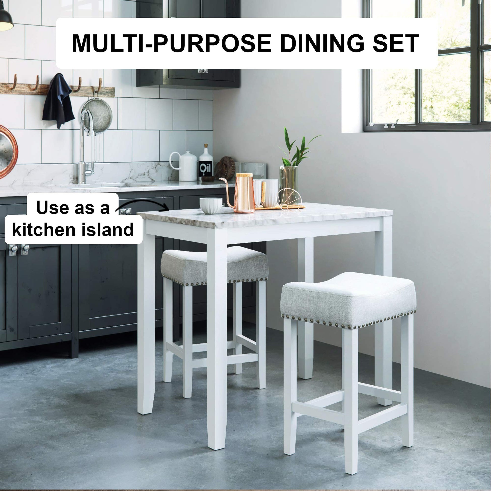 - Enjoy bistro dining with a marble-laminated table with two fabric stools.