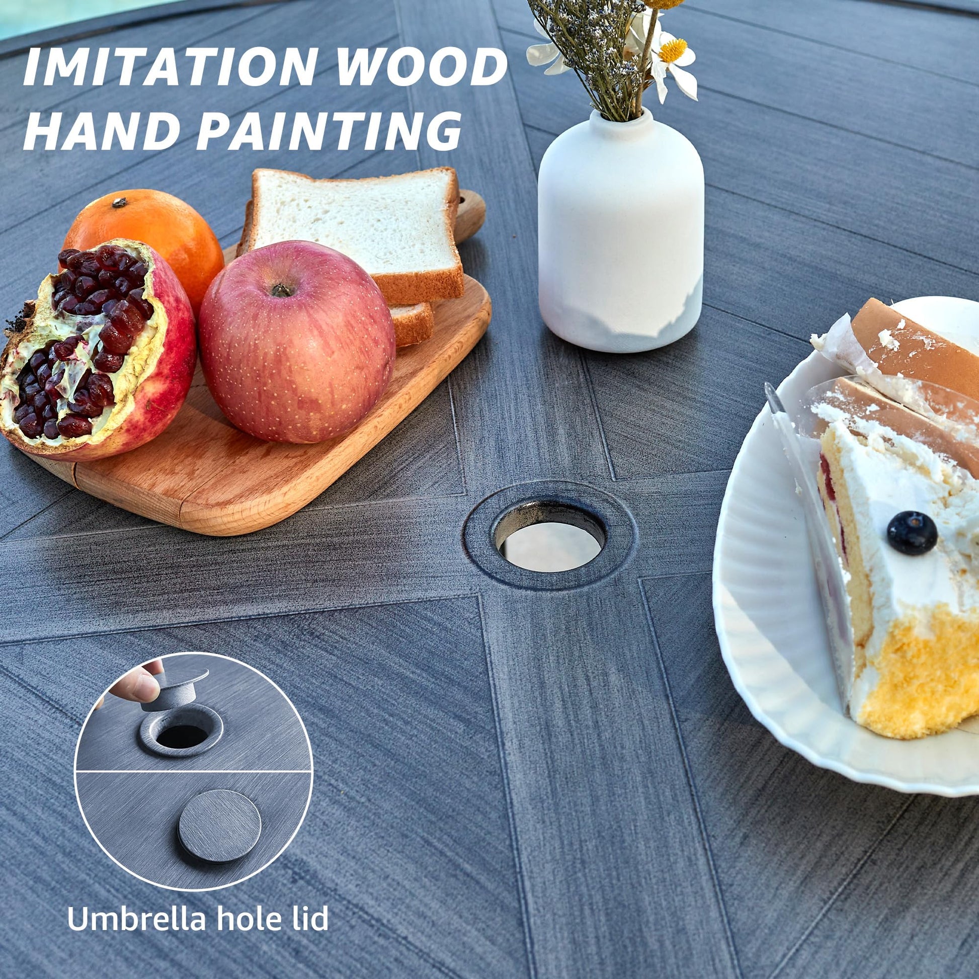 - Imitation Wood Hand Finish: The 38'' big round dining table and chairs are coated with a wood-like finish, providing a beautiful and natural aesthetic that blends seamlessly with outdoor environments.1.65'' umbrella hole and umbrella cover, you can choose whether to use the umbrella hole according to the weather, venue, party theme, covering the umbrella hole when not needed.