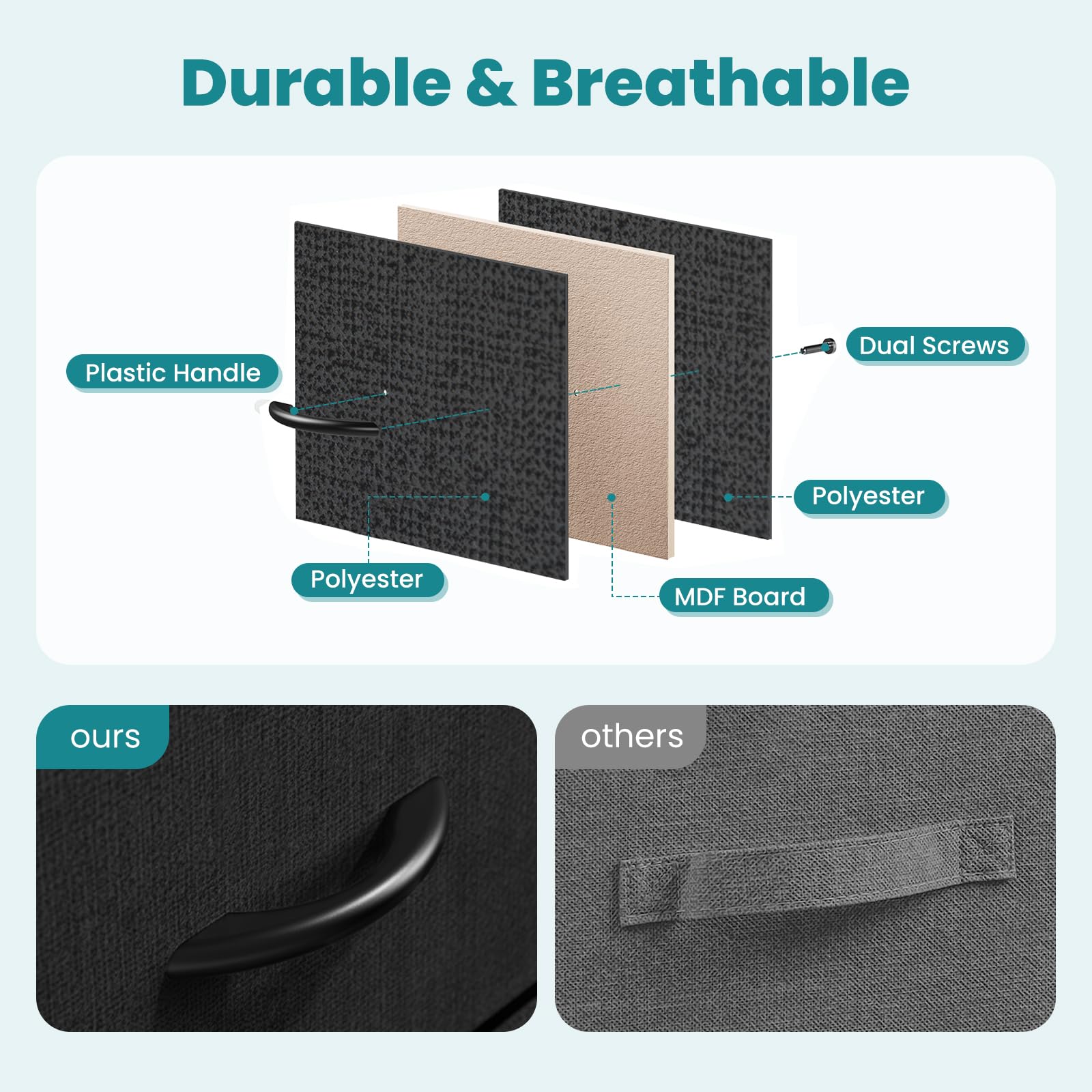 - We choose premium cationic material, all surfaces are made of high quality breathable and non-woven synthetic fiber, which is more durable and not easy to wrinkle, suitable for children, teenagers and adults. Easy pull handles help to open and close the drawers conveniently.