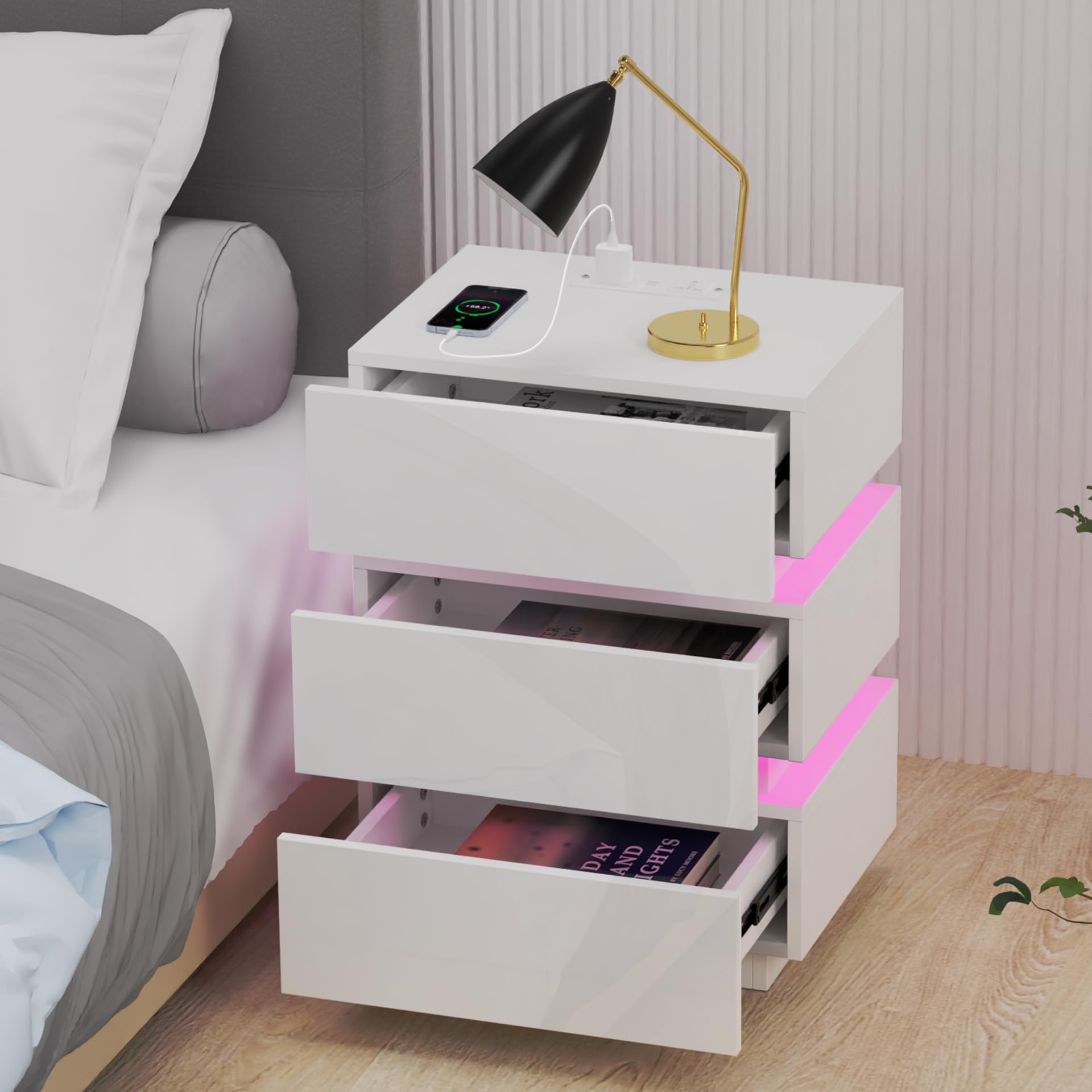 - Add 2 AC outlets and 2 USB ports, more charging spots for bedtime, plug in your phones and turn on your lamps, this smart nightstand will comfort your night time with convenient charging